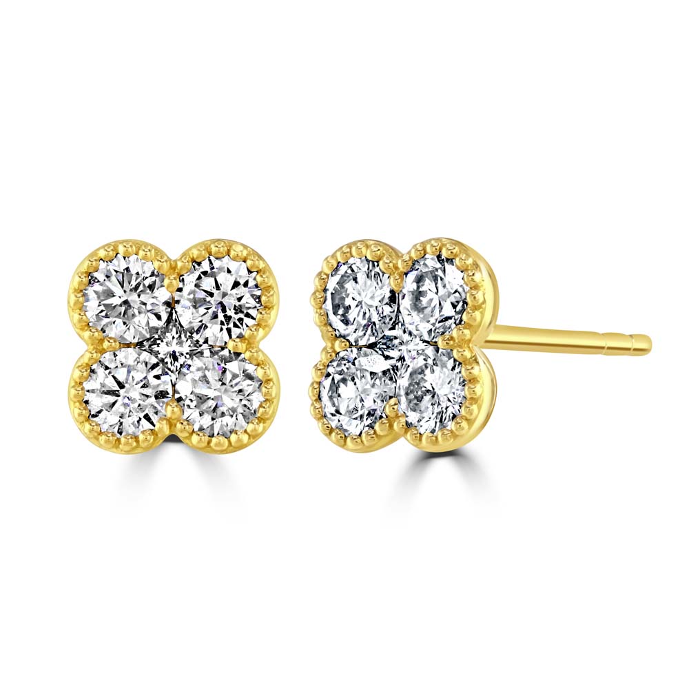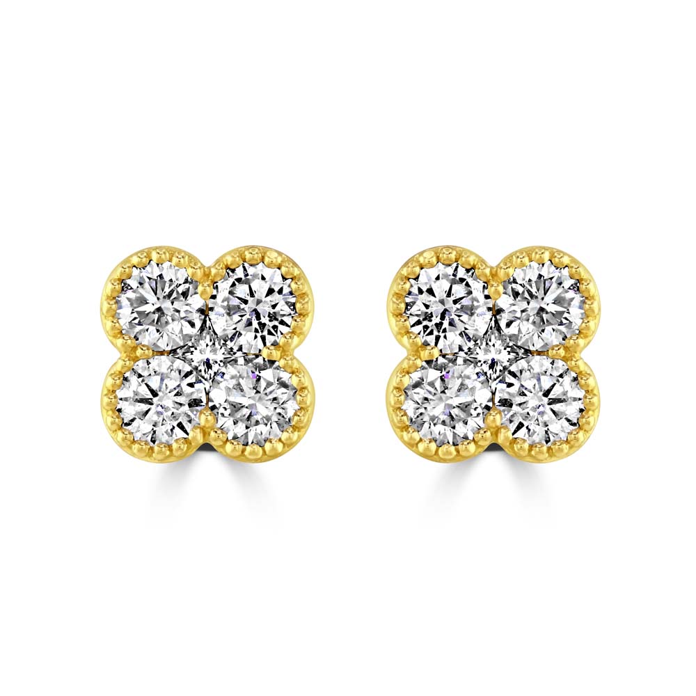 Introducing our exquisite 18ct yellow gold quatrefoil stud earrings, a stunning manifestation of classic design and modern craftsmanship. Each earring is artfully designed in a captivating quatrefoil shape, featuring a central princess-cut diamond complemented by four round brilliant-cut diamonds around the perimeter. The milgrain edging adds a touch of vintage charm, enhancing the intricate detail and overall sparkle of the diamonds. With a total diamond weight of 0.79 carats, these earrings dazzle with exceptional clarity and brilliance, set against the rich warmth of 18ct yellow gold. The combination of princess and round cut diamonds creates a dynamic interplay of light, making these earrings a standout addition to any jewellery collection. Perfect for special occasions or as an elegant daily accessory, these stud earrings offer versatility and sophistication. Their unique design and luxurious finish make them an ideal gift for a loved one or a splendid treat for yourself, promising to be cherished for years to come.