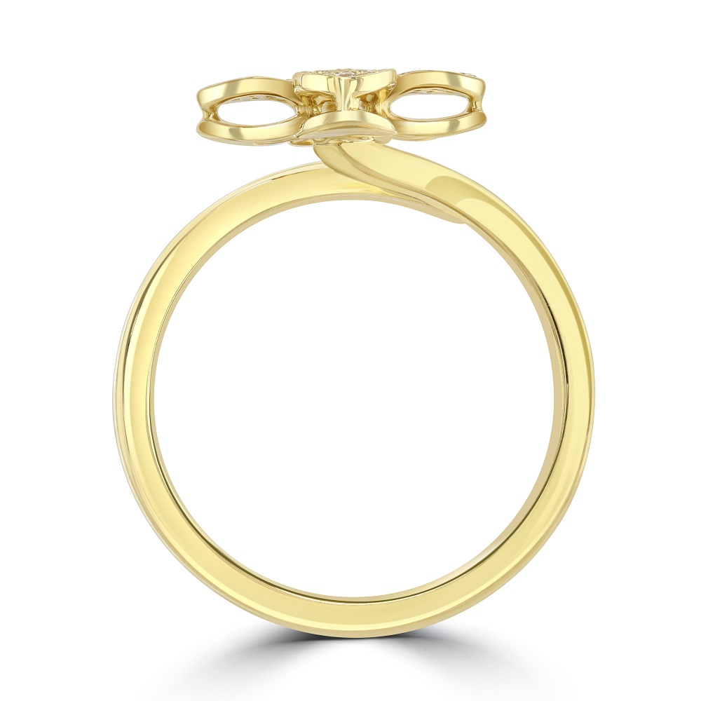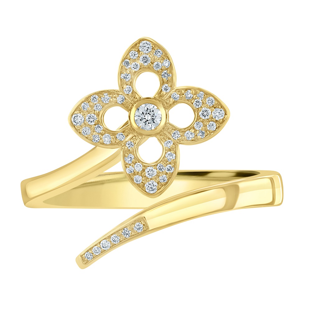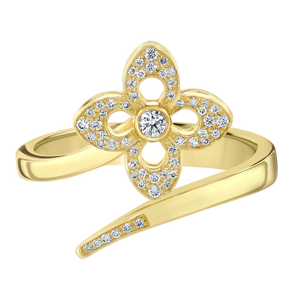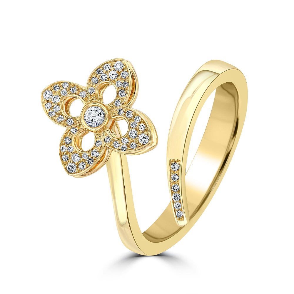 Our exquisite 18ct yellow gold open flower style crossover cluster ring, a stunning display of craftsmanship and elegance. This beautifully designed ring features a captivating open flower motif at the centre, highlighted by a rubover set round brilliant cut diamond. Surrounding this central diamond, smaller round brilliant cut diamonds are meticulously grain set to form four delicate petals, each sparkling with every movement. The ring’s unique crossover style extends to another cluster of grain-set round brilliant cut diamonds at the opposite end, enhancing the floral theme and adding an additional layer of brilliance. The entire piece is crafted in luxurious 18ct yellow gold, whose warm tones beautifully complement the shimmer of the diamonds, creating a rich and harmonious aesthetic. Perfect for those who appreciate intricate designs and the timeless appeal of yellow gold, this crossover cluster ring is a standout piece that makes a perfect gift for special occasions such as engagements, anniversaries, or as a treasured addition to your own jewellery collection.