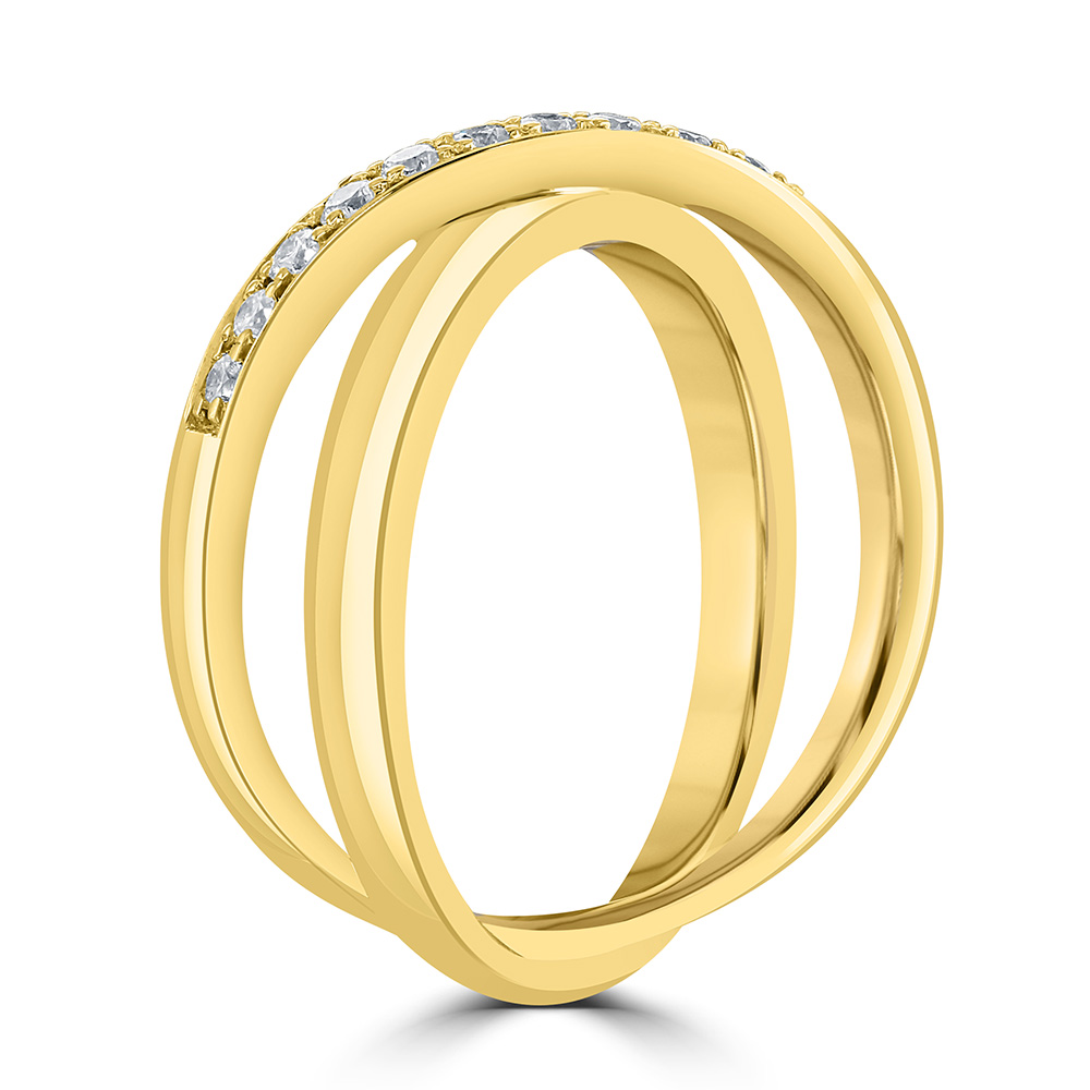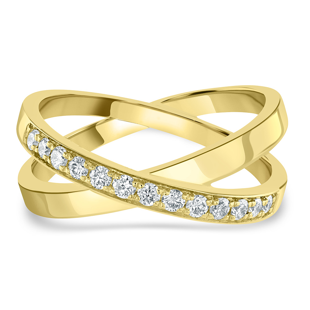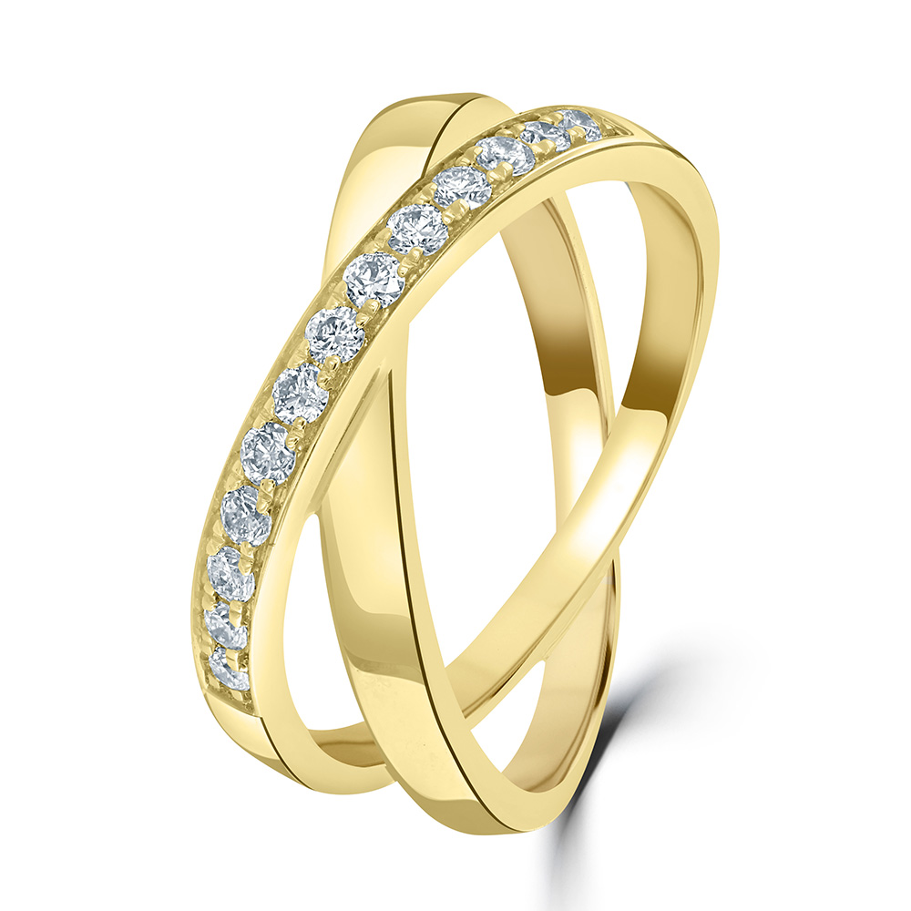 An elegant 18ct yellow gold two strand "X" ring, an exquisite piece that combines modern design with timeless sparkle. This sophisticated ring features a micro-claw set strand of 13 round brilliant cut diamonds, beautifully crossing over a polished gold strand. With a total diamond weight of 0.26ct, the diamonds are meticulously arranged to maximize brilliance and visual impact.
