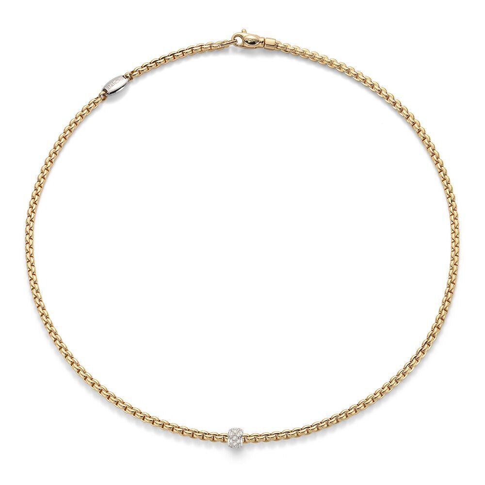Experience unparalleled Italian craftsmanship with our 18ct yellow gold Eka necklet from Fope Gioielli, a stunning addition to any luxury jewellery collection. This elegant necklet features a unique link design crafted in lustrous 18ct yellow gold, offering a sophisticated and modern aesthetic. The centrepiece is a single white gold rondel, fully pavé-set with sparkling diamonds totalling 0.19 carats, adding a touch of radiant glamour. This exquisite piece perfectly embodies Fope Gioielli's commitment to combining contemporary design with traditional elegance. Ideal for those seeking a statement piece that blends intricate detail with timeless style, this necklet is sure to enhance any ensemble