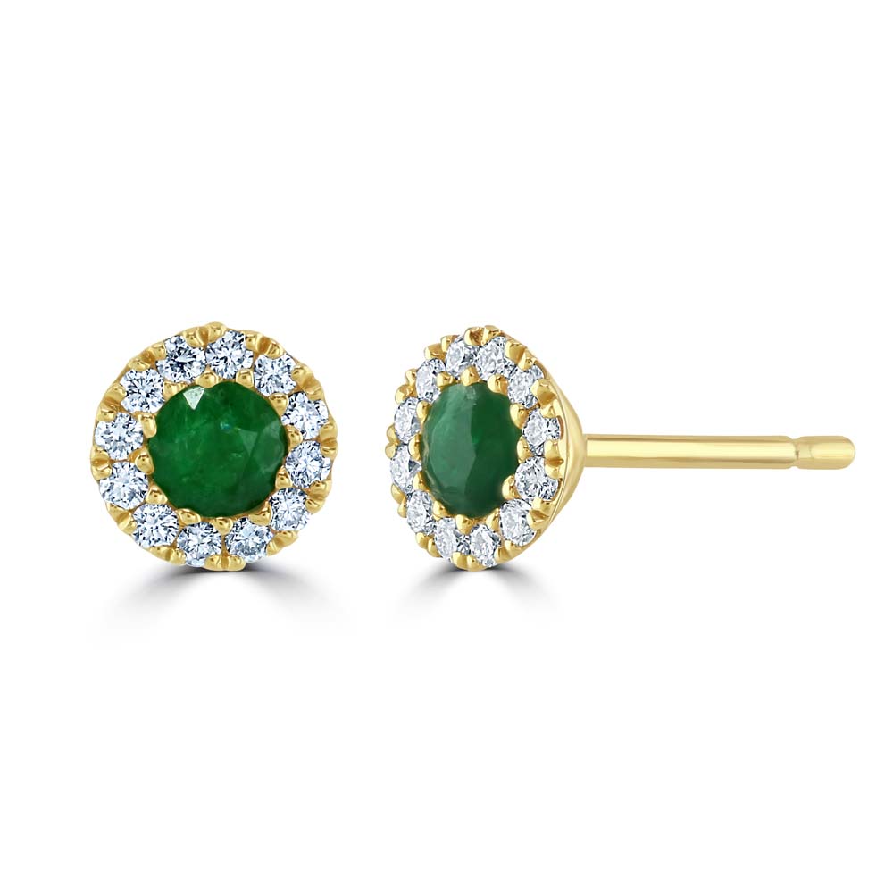 A luxurious pair of 18ct yellow gold circle cluster stud earrings, each centred with a vibrant round emerald weighing 0.34 carats. This exquisite green gemstone is encircled by twelve grain-set round brilliant cut diamonds, totalling 0.17 carats, that radiate light and add an exquisite sparkle. Designed with post and butterfly fittings for secure and comfortable wear, these earrings are a perfect blend of classic charm and modern sophistication. Ideal for adding a touch of glamour to any outfit, these stud earrings are a must-have for those who appreciate fine detailing and timeless beauty in their jewellery collection.