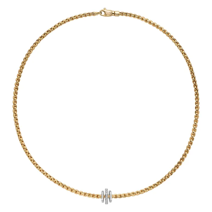 Introducing the exquisite 18ct yellow gold flexible rope style necklace, a standout piece from the Flex'It Eka range by Fope Gioielli, renowned for its Italian luxury and innovative design. This stunning necklace features a flexible, woven rope style in radiant 18ct yellow gold, providing both comfort and elegant appeal. Accentuating this design are three pentagonal rondels, with the central rondel enlarged and intricately set with brilliant round cut diamonds, totalling 0.15 carats. The subtle sparkle of the diamonds enhances the warm tones of the yellow gold, making this 43cm necklace a perfect choice for those seeking a mix of classic charm and contemporary flair. Ideal for both casual and formal settings, this piece embodies everyday luxury and sophisticated craftsmanship.
