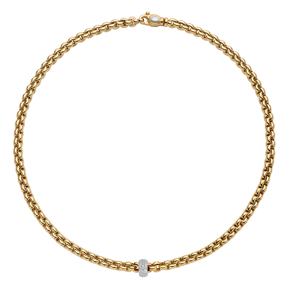An elegant 18ct yellow gold Flex'It Eka rope necklace, a masterpiece crafted by the renowned Fope Gioielli. This exquisite necklace blends timeless design with innovative craftsmanship, featuring a flexible, rope-style chain that epitomizes comfort and luxury. At the heart of this piece is a single white gold rondel, pavé set with three rows of dazzling round brilliant cut diamonds, adding a touch of sparkle and sophistication. The total diamond weight of 0.37ct ensures that this necklace sparkles with an understated elegance, perfect for both day and evening wear. Measuring 43cm in length, it sits gracefully at the collarbone, making it an ideal complement to a variety of necklines and styles. Crafted from the finest 18ct yellow gold, this Flex'It Eka rope necklace by Fope Gioielli is not just a piece of jewelry but a symbol of luxury and refinement. The innovative Flex'It design allows for unparalleled flexibility and comfort, ensuring that this necklace is not only beautiful but also a pleasure to wear.