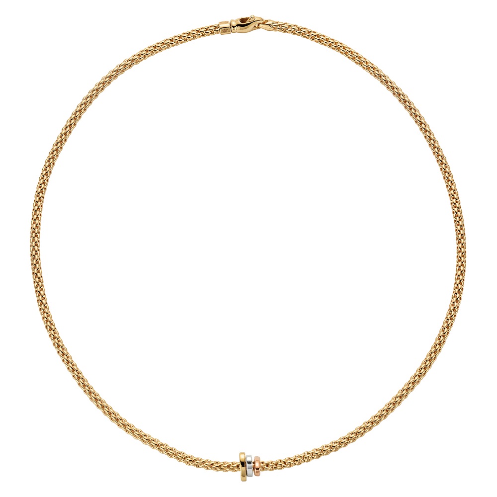 Discover unparalleled elegance with our 18ct Yellow Gold Flexible Necklace, a signature piece from the Flex'It Prima collection by Fope Gioielli. This meticulously crafted 43cm necklace features a flexible design for ultimate comfort and a flawless fit around the neck. The luxurious yellow gold chain is accentuated by three elegantly simple oval rondels in a stunning tri-colour combination of yellow, white, and rose gold. These rondels add a contemporary twist to the classic design, offering a versatile look that complements a variety of styles and occasions. Perfect for those who appreciate refined jewellery with a modern appeal, this exquisite necklace embodies Fope Gioielli's commitment to quality and Italian craftsmanship.
