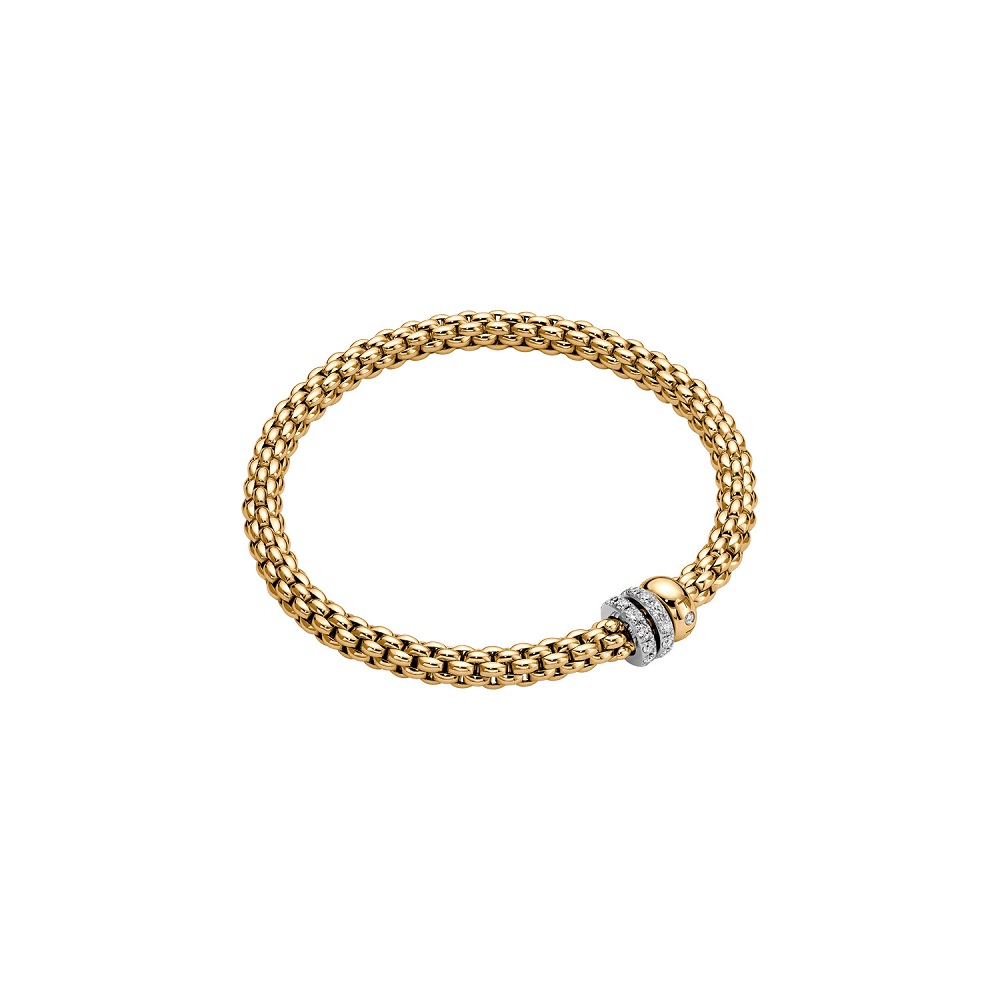 An exquisite 18ct Yellow Gold Flex'it Solo Bracelet, a signature piece from the renowned Fope Gioielli collection. This luxurious bracelet showcases a unique blend of elegance and innovation, featuring three meticulously fixed rondels. Among these, one dazzles in plain yellow gold, exuding classic elegance, while the other two are crafted from sophisticated white gold, each pavé set with sparkling round brilliant cut diamonds. The total diamond weight of 0.56ct adds a radiant sparkle, creating a stunning contrast against the warm hues of yellow gold. Crafted with the highest quality 18ct yellow gold, this Flex'it Solo Bracelet embodies Fope Gioielli's commitment to excellence and Italian craftsmanship. The bracelet's flexible design ensures a comfortable fit, making it a perfect choice for everyday luxury or special occasions. Ideal for those who appreciate the fine art of Italian jewellery and the timeless beauty of diamonds set against the rich tones of yellow and white gold, this Fope Gioielli Flex'it Solo Bracelet is a testament to luxury, sophistication, and impeccable style. Whether it's a gift for a loved one or a treat for yourself, this bracelet is sure to enchant and inspire.