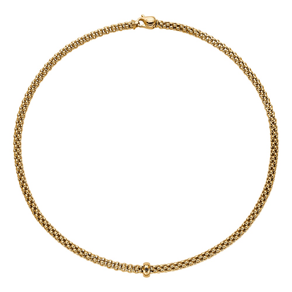 Experience the epitome of Italian craftsmanship with our 18ct yellow gold Flex'it Solo necklace by Fope Gioielli, a piece that blends timeless elegance with contemporary design. This exquisite necklace features a signature rondel in the centre, highlighted by a singular, striking black diamond that weighs 0.01 carats. The contrast between the vibrant yellow gold and the dark hue of the diamond creates a stunning visual impact. Measuring 43cm in length, this necklace is crafted with Fope's innovative Flex'it technology, ensuring a flexible and comfortable fit that adapts seamlessly to your neckline. Perfect for adding a touch of sophistication to any ensemble, this necklace is an ideal choice for those who value understated luxury and exceptional design.