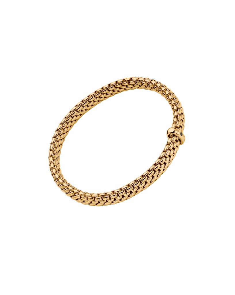 18ct yellow gold flexible bracelet with a single yellow gold rondel set with a black round brilliant cut diamond. Part of the Vendôme collection by Fope Gioielli Diamond weight: 0.01ct Size: X-Large