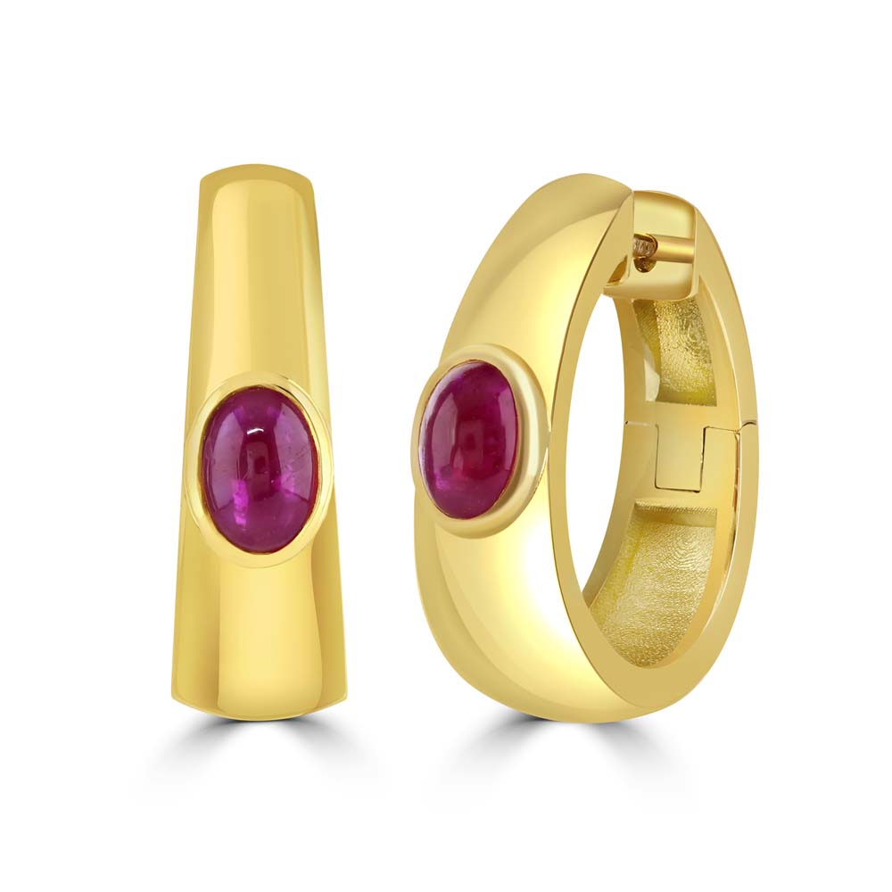 These exquisite hoop earrings are beautifully crafted in 18ct yellow gold, exuding both elegance and sophistication. Each earring is accentuated by a single oval cabochon ruby, set to showcase its luscious, deep red colour and smooth, polished surface. The cabochon cut enhances the ruby's natural allure, offering a unique and contemporary flair. The earrings feature a hinged design, ensuring they fit snugly around the earlobe for a comfortable and secure wear. The rich hue of the ruby pairs perfectly with the warm glow of the yellow gold, creating a luxurious and timeless piece of jewellery, ideal for adding a touch of refined glamour to any ensemble