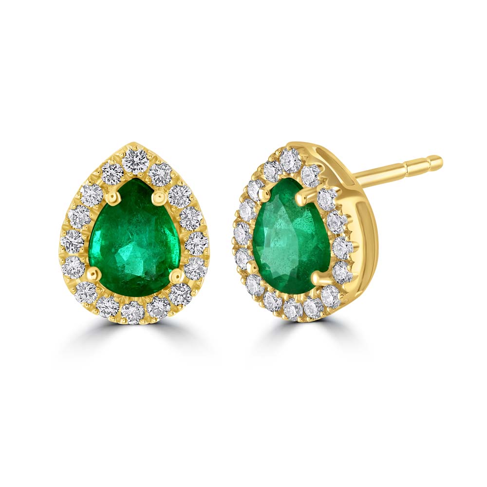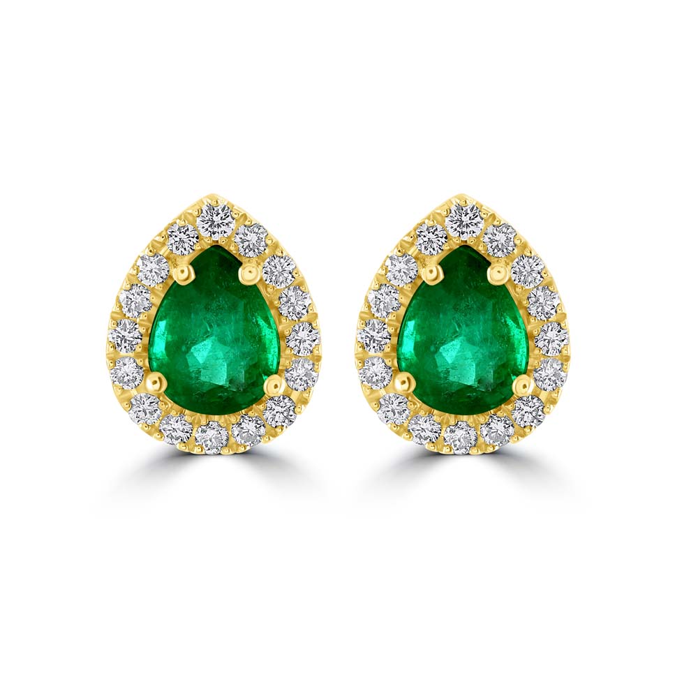 Refined and radiant, these 18ct yellow gold stud earrings each feature a captivating pear-cut emerald, held securely in a classic four-claw setting. Surrounded by a delicate halo of round brilliant-cut diamonds, the 1.10ct total emerald weight is beautifully complemented by 0.26ct of sparkling diamonds, creating a harmonious blend of vivid green and shimmering light. Designed with post and butterfly fittings for a secure and comfortable fit, these earrings are perfect for adding a touch of timeless elegance to both everyday wear and special occasions. Celebrate the allure of emeralds with these exquisite yellow gold cluster stud earrings—a graceful addition to any fine jewellery collection.