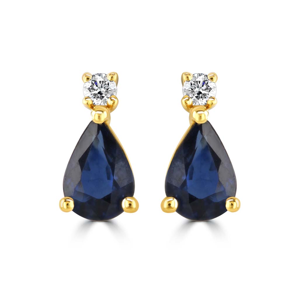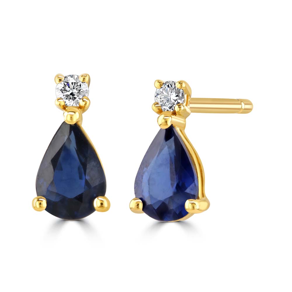 Enhance your elegance with these stunning 18ct yellow gold drop stud earrings. Each earring features a single round brilliant-cut diamond, securely set in a four-claw setting, adding a touch of sparkle. Below, a beautiful pear-cut sapphire, set in a three-claw setting, dangles gracefully, showcasing its deep blue hue. Designed with post and butterfly fittings, these earrings ensure a secure and comfortable fit. With a total sapphire weight of 0.82ct and a total diamond weight of 0.05ct, these earrings combine the timeless beauty of diamonds with the rich allure of sapphires. Perfect for special occasions or everyday wear, they will add a touch of refined elegance to any ensemble.
