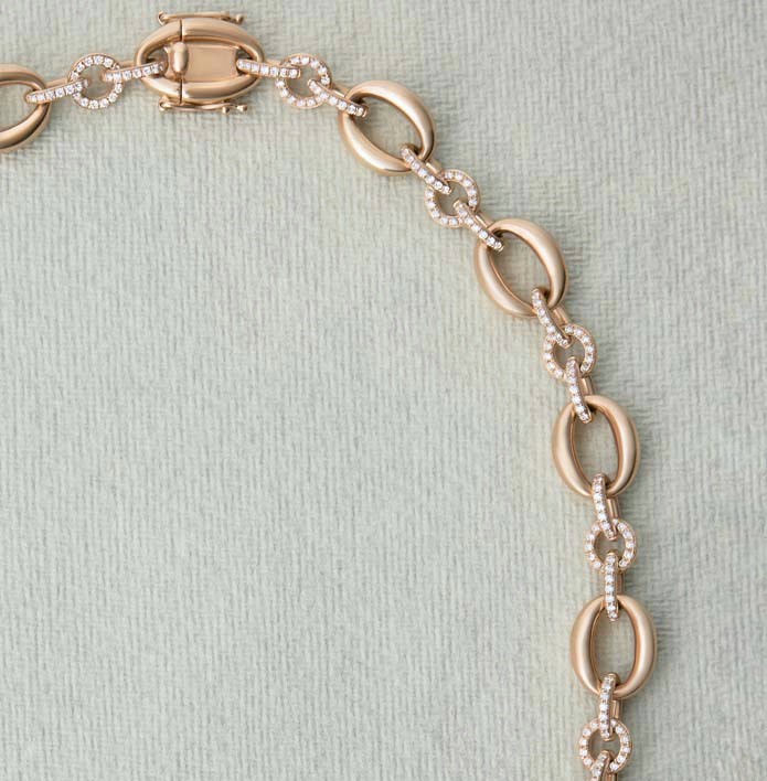 Introducing our luxurious 18ct yellow gold necklace, a stunning statement piece that effortlessly combines classic elegance with a touch of modern sophistication. This exquisite necklace features alternating plain oval links and three intricately diamond-set links—two oval-shaped and one round—creating a captivating pattern that is both stylish and timeless. The three diamond-set links are adorned with a total of 448 diamonds, collectively weighing 3.21cts. These diamonds sparkle brilliantly, enhancing the rich yellow gold with their clear, radiant light. This design not only adds a dazzling visual interest but also exudes luxury and high fashion. Secured with a large oval clasp that includes a double safety catch, this necklace promises both style and security, ensuring that it remains comfortably in place while wearing. The clasp itself is a focal point, echoing the elegance of the link design and completing the necklace with a seamless finish. Perfect for high-profile events, elegant evening wear, or as a standout addition to any formal outfit, this yellow gold and diamond necklace is a truly exquisite choice for those who appreciate fine jewellery with a significant impact. It is an ideal heirloom piece, promising to be cherished for generations to come.