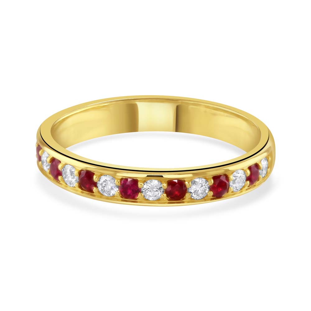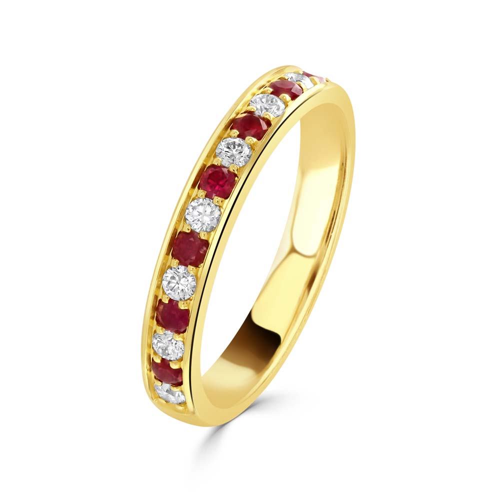 Enhance your jewellery collection with our luxurious 18ct yellow gold half eternity ring, featuring a delicate grain setting that beautifully alternates between seven round rubies and eight round brilliant cut diamonds. This exquisite ring combines the deep, vibrant hues of rubies totalling 0.19 carats with the sparkling brilliance of diamonds weighing a total of 0.18 carats. Designed to symbolize everlasting love, this ring is perfect for anniversaries, special occasions, or as a meaningful gift. The timeless design and sophisticated craftsmanship ensure it will be a cherished piece for years to come, making it a standout addition to any fine jewellery ensemble.