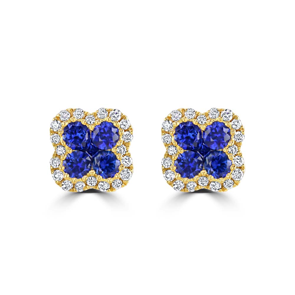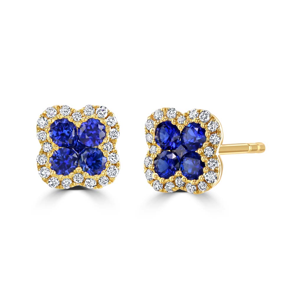 Add a touch of refined elegance to your jewellery collection with these beautifully crafted 18ct yellow gold clover stud earrings, inspired by nature and designed for timeless sophistication. Each earring features four round cut sapphires forming the clover’s petals, with a square sapphire at the centre, creating a vibrant and harmonious composition. Surrounding the sapphires is a delicate halo of round brilliant cut diamonds, adding a subtle sparkle and enhancing the overall brilliance of the design. Finished with a vintage-style milgrain edge and post and butterfly fittings, these earrings offer secure and comfortable wear for pierced ears. With a total sapphire weight of 0.42cts and diamond weight of 0.11cts, these earrings are perfect for those seeking luxury gemstone jewellery that blends classic charm with modern craftsmanship.