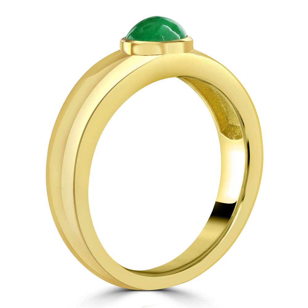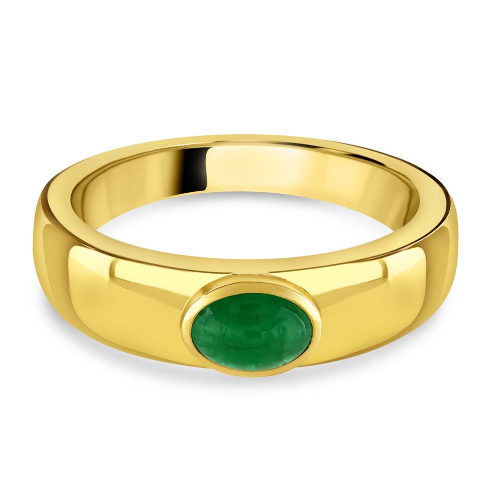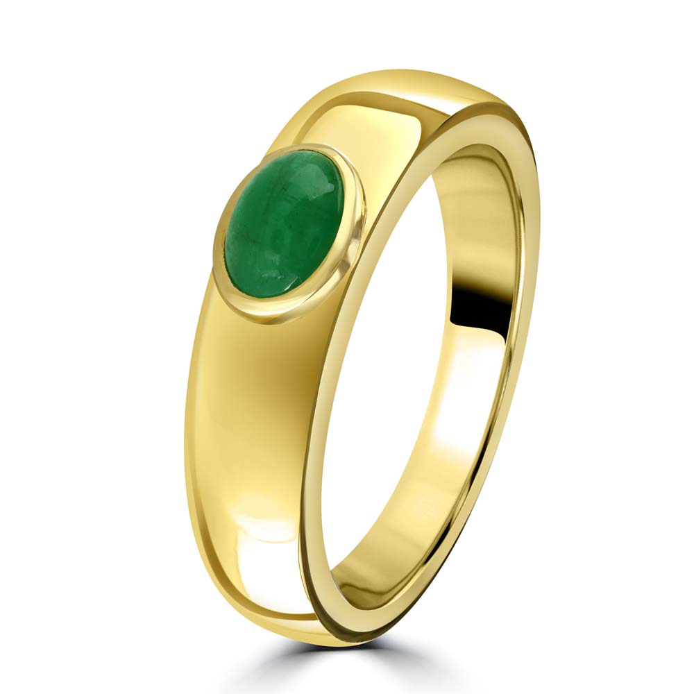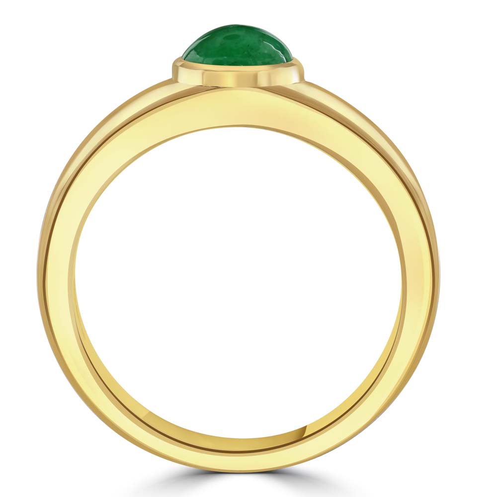 Discover the timeless elegance of our 18ct yellow gold solitaire ring, designed to captivate with its stunning simplicity and luxurious craftsmanship. This exquisite ring features a single cabochon cut oval emerald, securely set in a classic rubover setting. The emerald, weighing 0.43 carats, boasts a smooth, polished surface and a vibrant green hue, making it the perfect centrepiece for this elegant piece. Ideal for marking special occasions or adding a touch of sophistication to your jewellery collection, this 18ct yellow gold solitaire ring combines timeless design with exceptional quality. The rich yellow gold band beautifully complements the vivid green of the emerald, creating a piece that symbolizes enduring love and elegance. The cabochon cut of the emerald adds a unique and contemporary twist to the traditional solitaire design, ensuring that the ring stands out in any setting. The smooth, rounded surface of the cabochon cut allows the emerald's natural beauty and depth of colour to shine through, making it a captivating focal point. Perfect for both everyday wear and special occasions, this ring is a versatile addition to any jewellery collection. Whether worn alone or paired with other fine pieces, it exudes an air of sophistication and timeless charm.