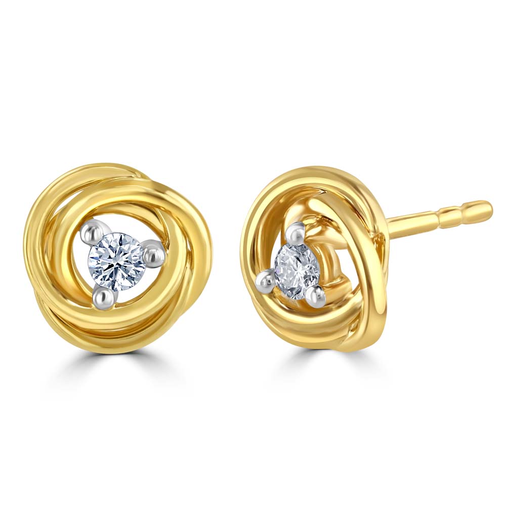 Captivating 18ct yellow gold stud earrings, a perfect blend of classic design and modern craftsmanship. Each earring showcases an enchanting design of three meticulously crafted swirls of yellow gold, creating a visually striking pattern that captures the essence of sophistication. At the centre of this elegant swirl, a claw-set round brilliant cut diamond sparkles, with a total diamond weight of 0.10ct for the pair, adding a touch of luxury and brilliance. Designed for comfort and security, these earrings come equipped with post and butterfly fittings, ensuring they stay in place all day long. Ideal for adding a refined touch to any outfit, these yellow gold and diamond stud earrings are a must-have addition to any jewellery collection.
