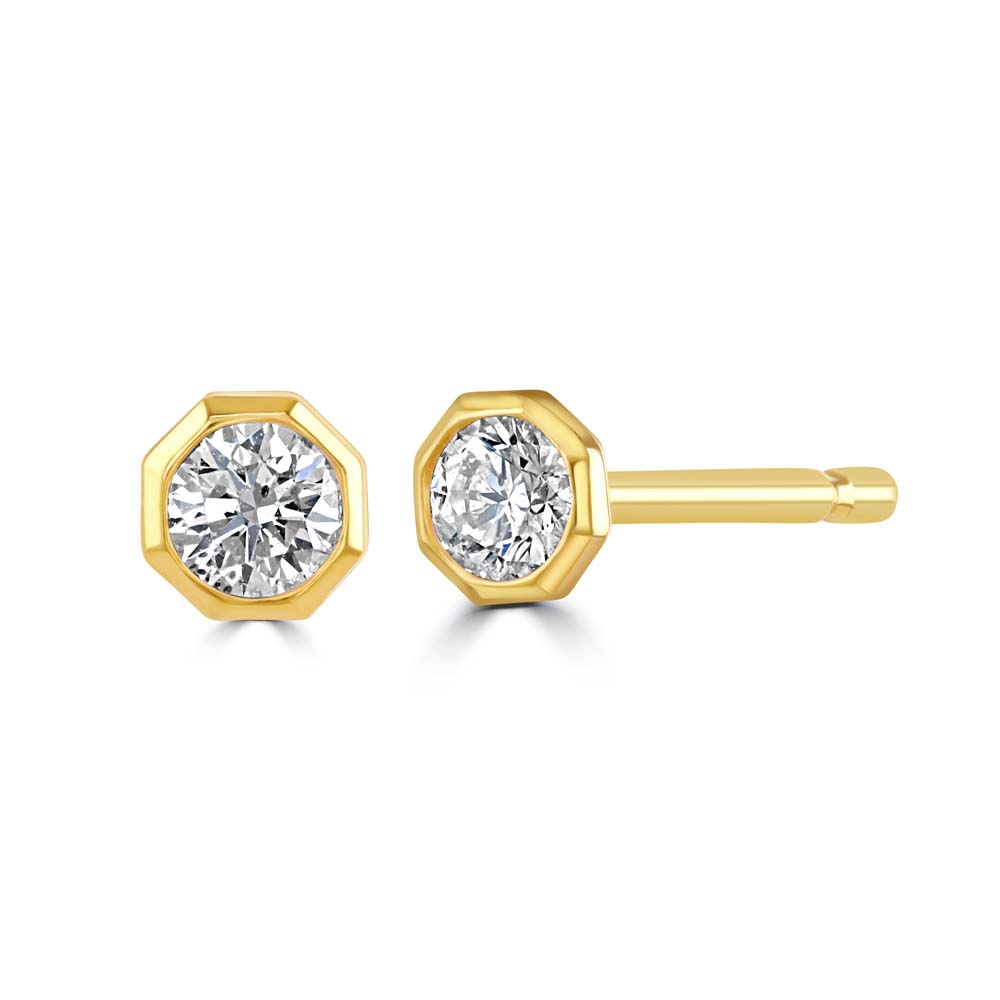 Add a touch of sophistication to your jewellery collection with these stunning 18ct yellow gold stud earrings. Each earring features a single round brilliant-cut diamond, securely rubover set in an elegant octagon-shaped setting. The unique design enhances the diamond's brilliance, making these earrings a standout piece. Designed with post and butterfly fittings, these earrings ensure a secure and comfortable fit. With a total diamond weight of 0.15ct, these earrings combine modern design with timeless luxury. Perfect for special occasions or everyday wear, they will add a touch of refined elegance to any ensemble.