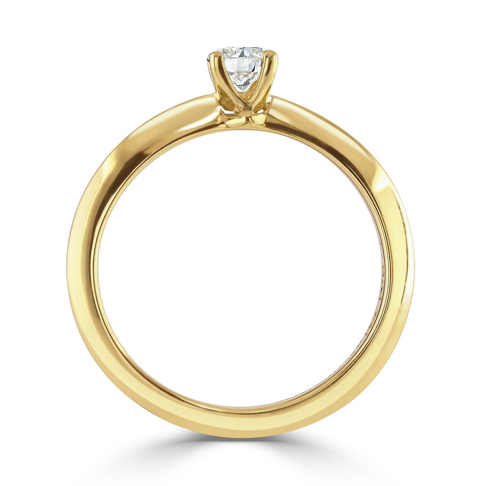 A stunning 18ct yellow gold single diamond knife-edge ring, a masterful combination of classic elegance and modern design. This exquisite ring features a four-claw setting that securely holds a round brilliant cut diamond, weighing 0.30ct.