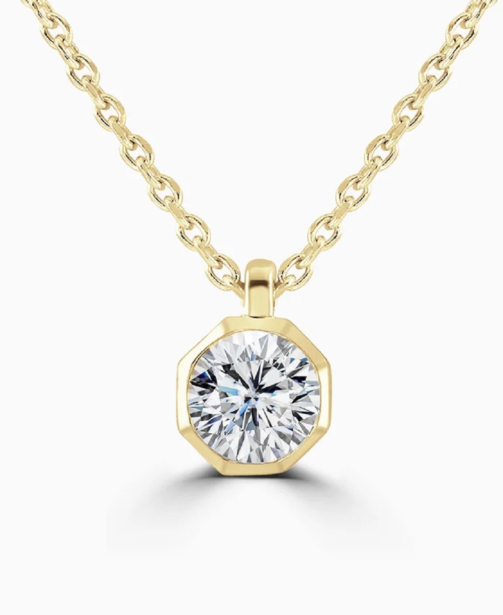 Elevate your elegance with this exquisite 18ct yellow gold pendant. Featuring a single, round brilliant cut diamond set in a unique octagon-shaped bezel setting, this pendant is a true statement piece. The diamond, weighing 0.41ct, sparkles brilliantly against the rich gold backdrop. The pendant comes with an 18-inch trace chain, adjustable to 16 inches, ensuring a perfect fit for any neckline.
