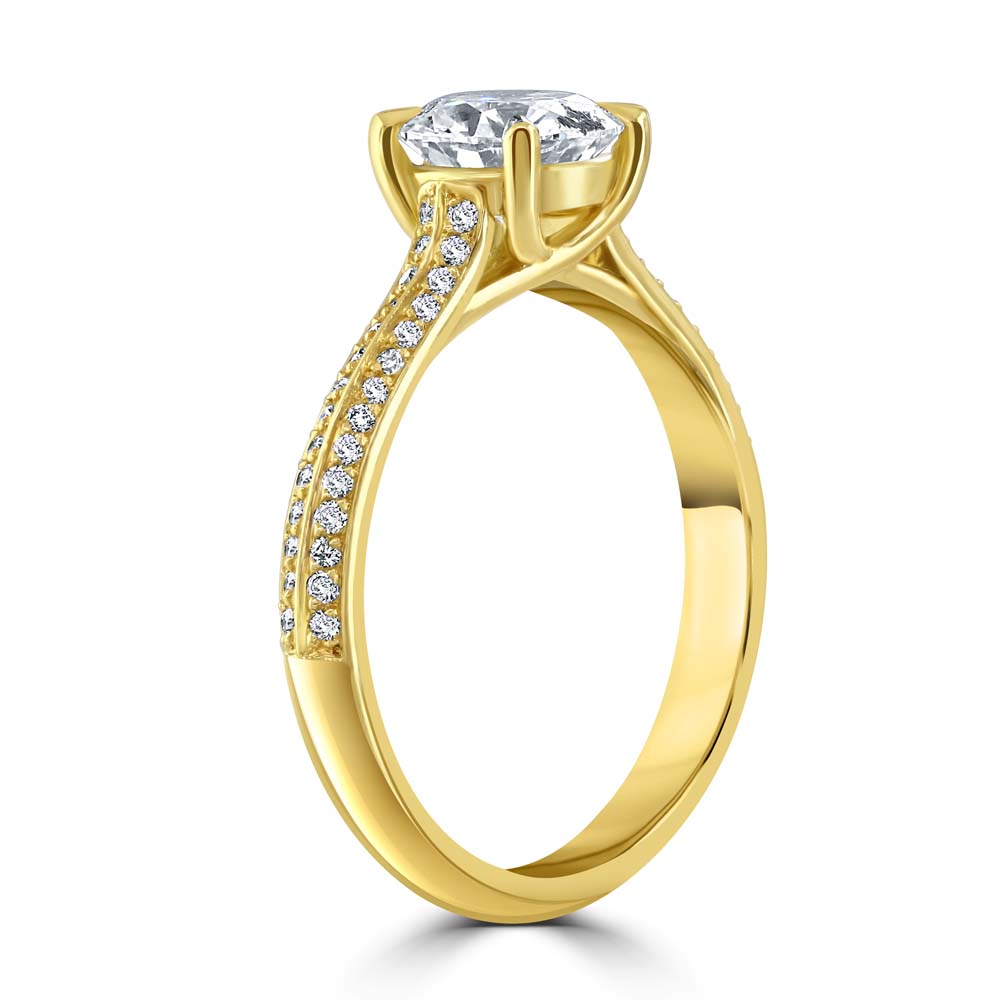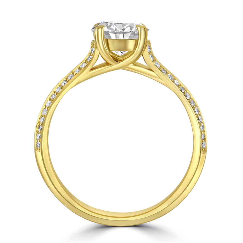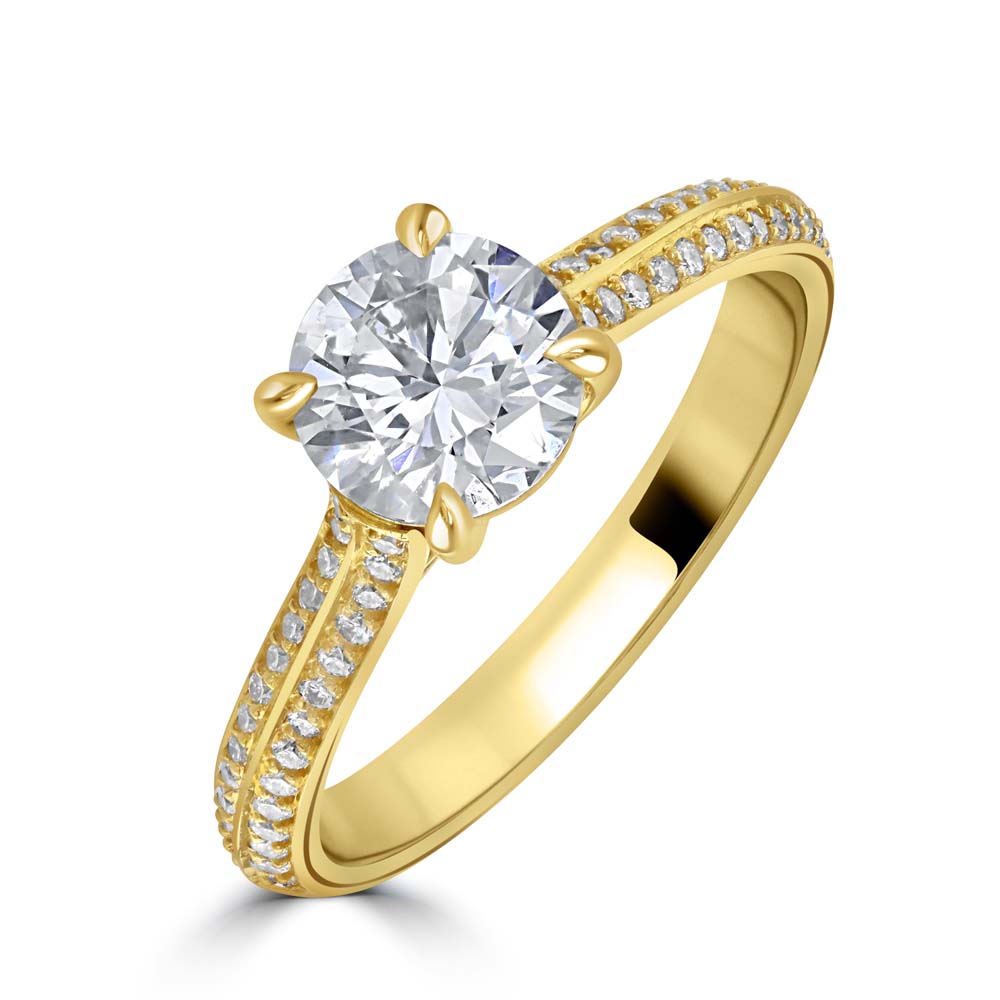 A stunning 18ct yellow gold solitaire ring, a masterpiece designed to captivate and enchant. At the heart of this exquisite piece lies a 1.12ct round brilliant cut diamond, meticulously set in a four-claw arrangement to accentuate its luminous brilliance. This central gemstone is of the highest calibre, boasting a D colour rating and SI2 clarity, ensuring a dazzling display of light and luxury. Further enhancing its allure, each shoulder of the ring is adorned with two rows of 14 round brilliant cut diamonds, adding a cascade of sparkle that complements the central stone’s magnificence. Crafted with precision and care, this ring is a testament to timeless elegance and sophistication. This beautiful ring with its detailed diamond shoulders promises to be a cherished symbol of love and commitment.