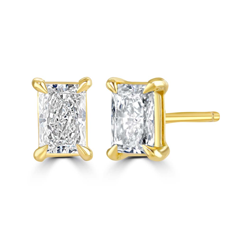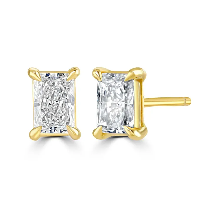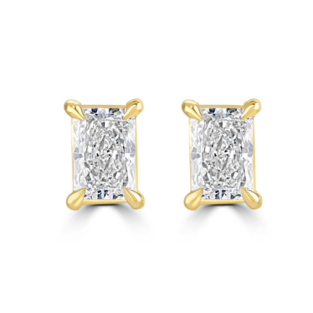 Enhance your elegance with these exquisite 18ct yellow gold stud earrings. Each earring features a stunning long radiant cut diamond, securely set in a four-claw setting. The radiant cut diamonds, with a total weight of 0.80ct, exhibit exceptional brilliance and fire, making these earrings a true statement piece. Designed with post and butterfly fittings for pierced ears, these earrings ensure a secure and comfortable fit. The diamonds are of G colour and VS1 clarity, certified by GIA, guaranteeing their quality and authenticity. Perfect for any occasion, these earrings combine timeless design with luxurious appeal, adding a touch of refined elegance to your jewellery collection.
