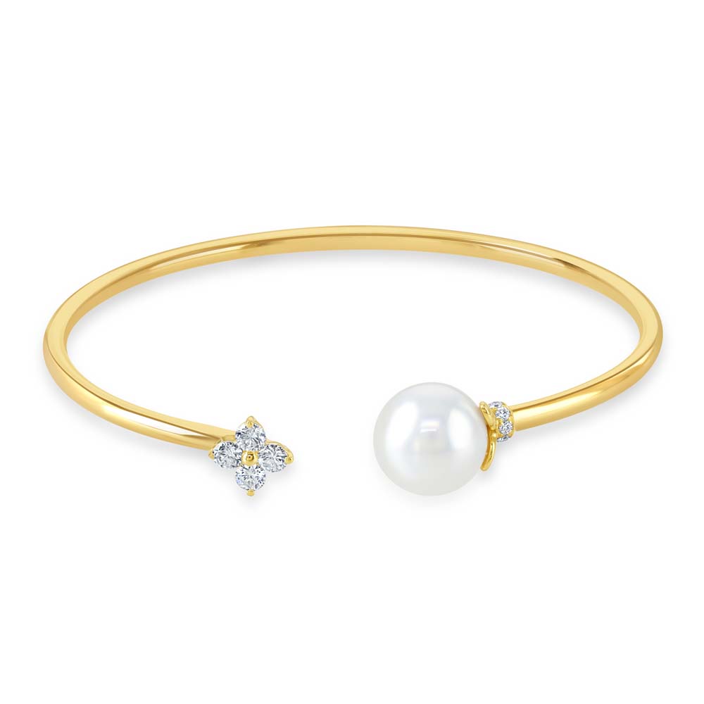 A striking blend of elegance and modern design, this 18ct yellow gold torque-style bangle showcases a single South Sea cultured pearl (10.5–11.0mm) as its centrepiece, radiating natural beauty and sophistication. Surrounding the base of the pearl are micro-set round brilliant-cut diamonds, adding a delicate sparkle. At the opposite end, four claw-set round brilliant-cut diamonds provide a perfect balance of brilliance and refinement. With a total diamond weight of 0.47ct, this piece is a true statement of luxury and craftsmanship. Combining the luminous beauty of a South Sea pearl with the sparkle of diamonds, this bangle is designed for those who appreciate bold elegance and timeless sophistication. Perfect for special occasions or as a signature piece in your collection.