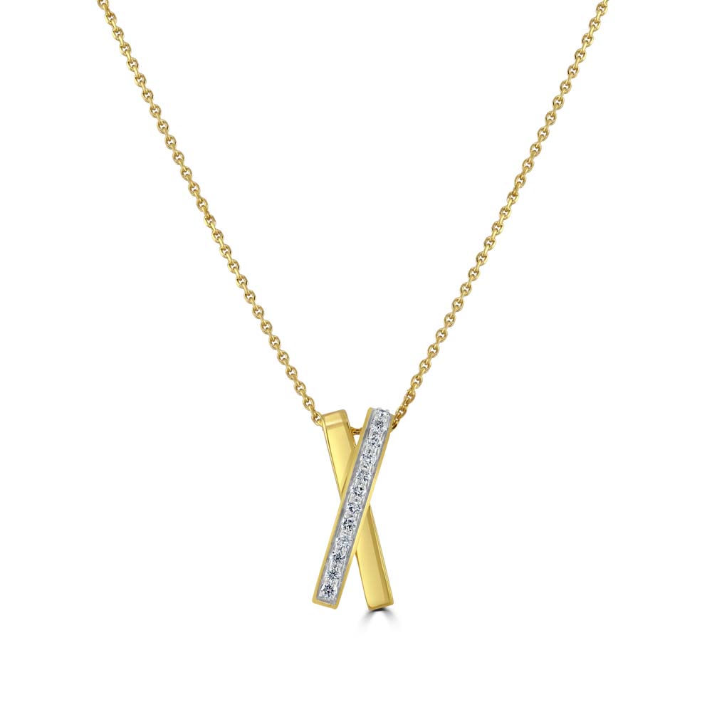 Our exquisite 18ct yellow gold "kiss” pendant, a masterful blend of luxury and design. This unique pendant features two strands forming a chic "X" shape, with one strand adorned with 12 round brilliant-cut diamonds. These diamonds are expertly micro-claw set in a white gold channel, offering a striking contrast against the yellow gold. The other strand boasts a sleek, polished finish, elegantly crossing behind to complete the sophisticated design.