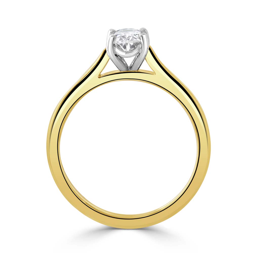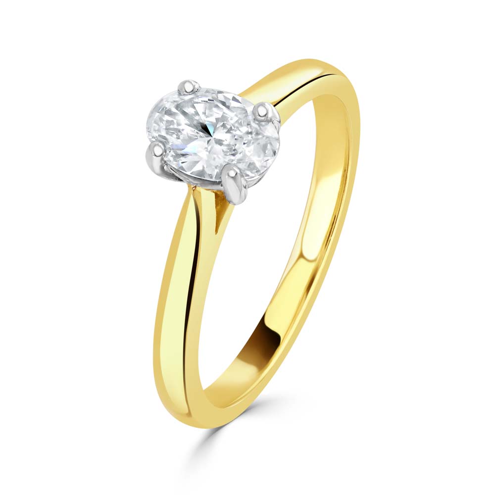 Discover the refined beauty of our 18ct yellow and platinum solitaire ring, a stunning piece that embodies classic elegance with a modern twist. This exquisite ring features a GIA-certified oval cut diamond, weighing 0.50 carats, set in a four-claw setting to showcase its brilliant clarity (SI1) and vibrant colour (E). The diamond is mounted on a gracefully tapered shank that combines both yellow gold and platinum, offering a striking contrast and adding a contemporary flair to the timeless solitaire design. Ideal for engagements, anniversaries, or as a luxurious gift, this solitaire ring is crafted to impress and signify a lifetime of love and commitment.