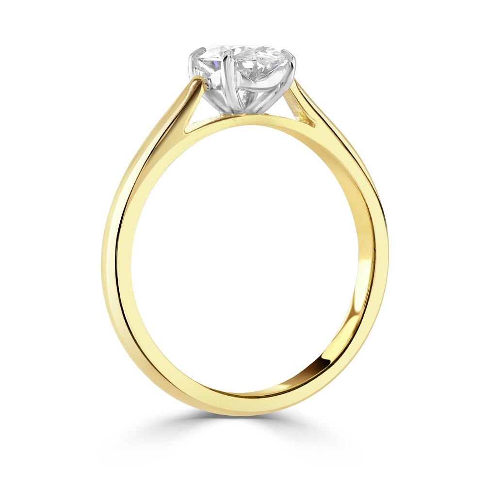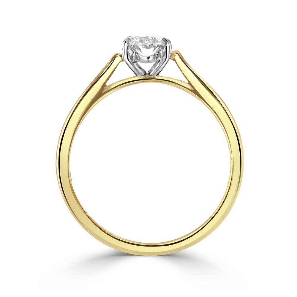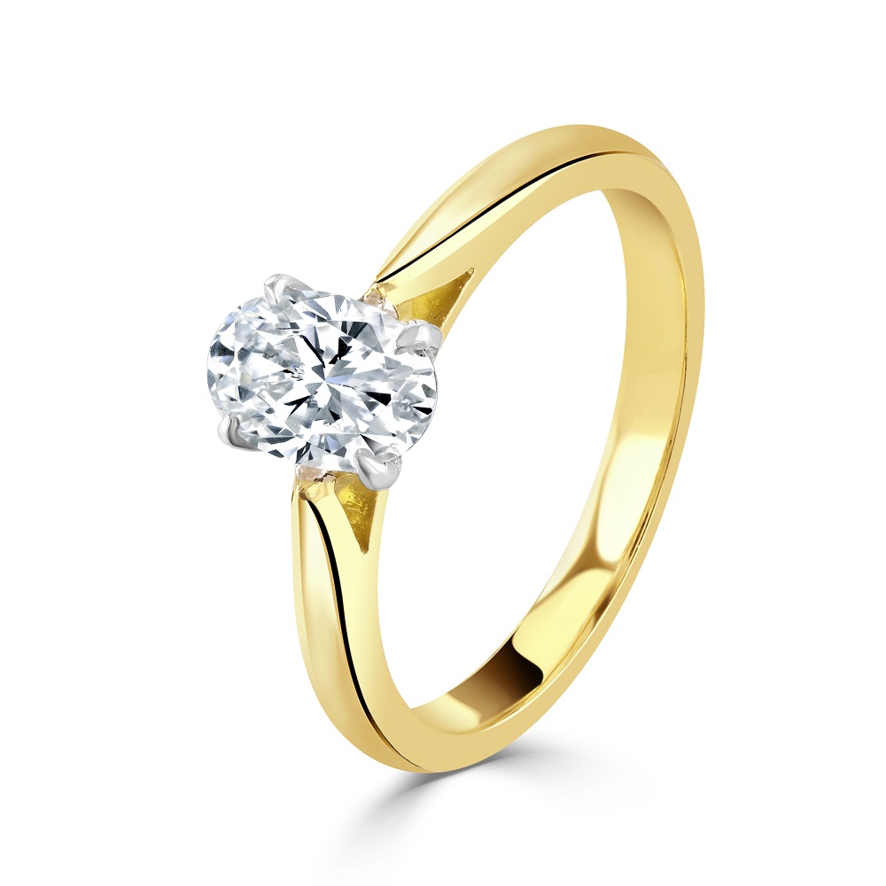 A beautiful solitaire engagement ring with an elegant, certified E colour oval cut diamond held in a bright platinum claw setting. The setting allows the maximum amount of light into the diamond to show off its fire and brilliance to its best. The 18ct yellow gold band has tapered shoulders which focuses the eye on the sparkling diamond. Like many of our rings this piece has been hand finished and set in in the UK. Other sizes and variations are available, please contact the store for more information.