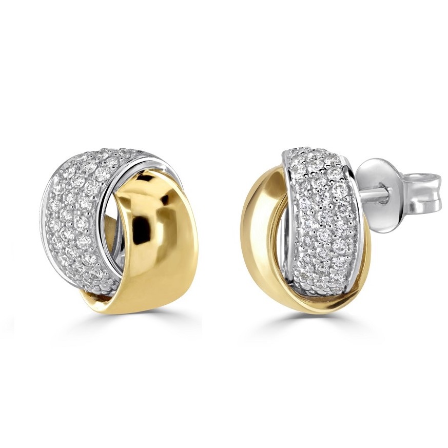 Our beautifully crafted stud earrings are designed to dazzle with every turn. Made from the finest 18ct yellow and white gold, these earrings feature two harmoniously overlapping strands—one in sleek yellow gold and the other adorned with shimmering pavé-set diamonds. Enhance your jewellery collection with these exquisite earrings, where luxury meets style.