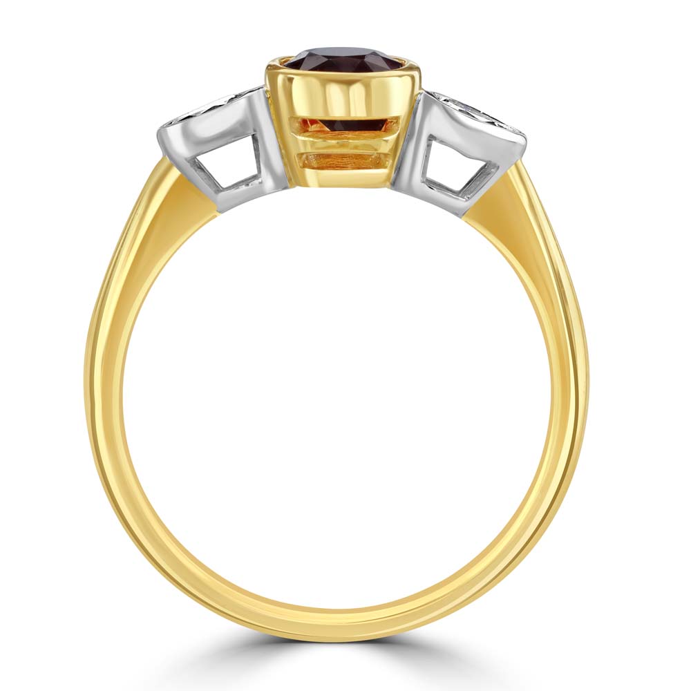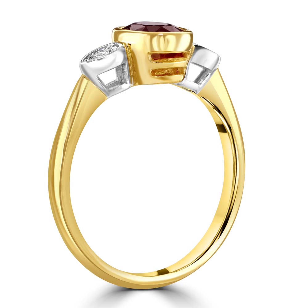 Celebrate the beauty of everlasting love with this enchanting trilogy ring, a symbol of past, present, and future devotion. Expertly crafted in a luxurious blend of 18ct yellow and white gold, the design frames a breathtaking oval-cut ruby at its heart, weighing 1.15 carats—its deep crimson glow evoking passion and vitality. On either side, two delicate pear-cut diamonds (total weight 0.19 carats) shimmer with timeless brilliance, their graceful curves echoing the elegance of true romance. Each stone is securely embraced in a sleek rubover setting, creating a seamless harmony of colour, light, and form. A piece as meaningful as it is beautiful, this ring is the perfect expression of love’s enduring journey—ideal for marking life’s most treasured moments.