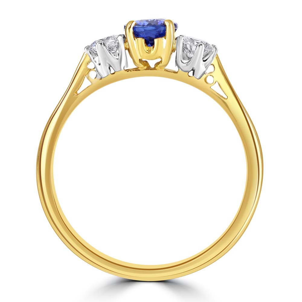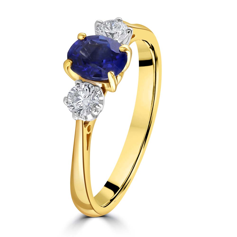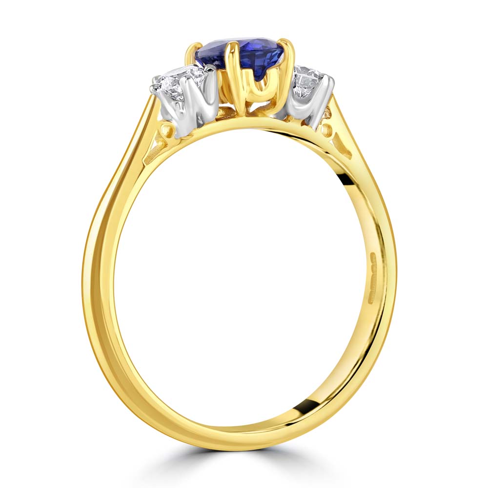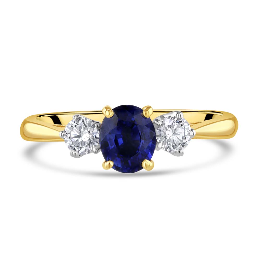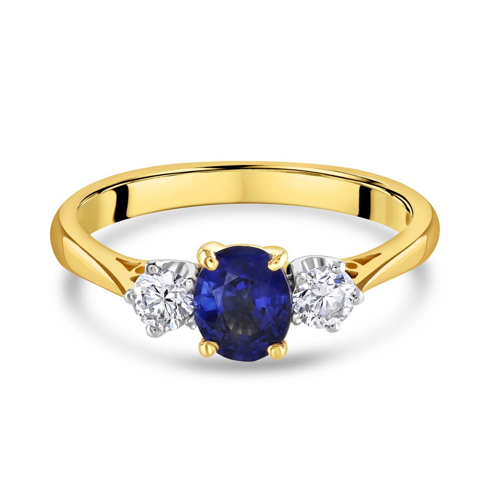 A graceful interpretation of the classic trilogy design, this exquisite ring is crafted in 18ct yellow and white gold, offering a harmonious blend of warmth and brilliance. At its centre lies a beautifully proportioned 0.73 carat oval-cut sapphire, held in a timeless four-claw setting that highlights its rich, velvety blue hue. Flanking the sapphire are two round brilliant-cut diamonds, each secured in a refined six-claw setting. With a combined weight of 0.27 carats and graded G colour, VS clarity, these diamonds offer exceptional sparkle and purity, enhancing the sapphire’s natural allure. Elegant and meaningful, this ring is a perfect symbol of enduring love, making it an ideal choice for an engagement, anniversary, or a treasured personal milestone.