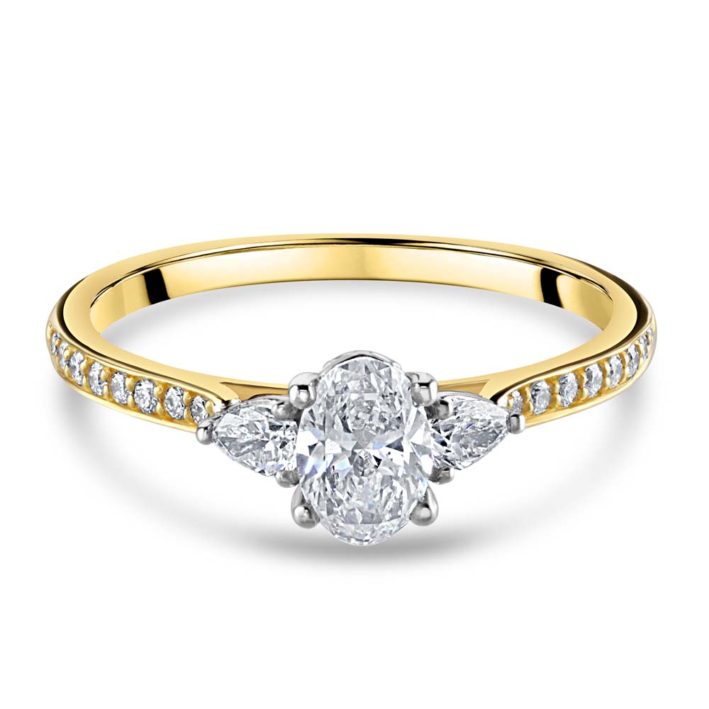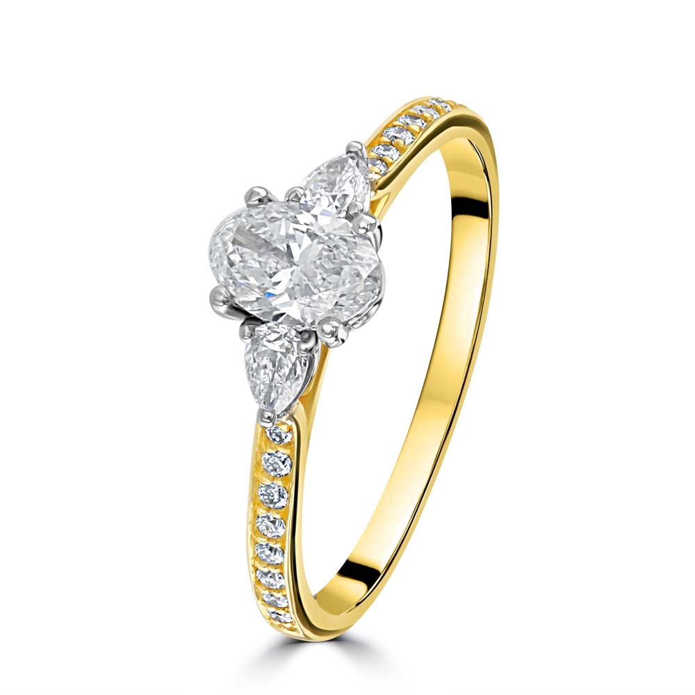 An exquisite 18ct yellow and white gold ring, a masterpiece that beautifully symbolizes the journey of love. This exquisite ring features a central 0.50ct oval cut diamond, set in a secure 4-claw setting. The diamond, with its impressive F colour and SI1 clarity, radiates exceptional brilliance and fire. Flanking the central diamond are two pear cut diamonds, each set in a delicate 3-claw setting. These diamonds add a touch of sophistication and sparkle, perfectly complementing the oval centre stone. Enhancing the ring’s luxurious appeal are diamond set shoulders, adding extra brilliance and elegance. The ring also features a decorative gallery, showcasing intricate craftsmanship and attention to detail. The combination of 18ct yellow and white gold creates a harmonious and sophisticated design, making this ring a perfect symbol of enduring love and commitment.