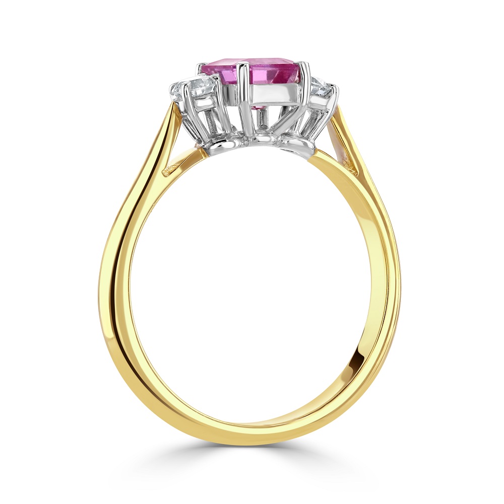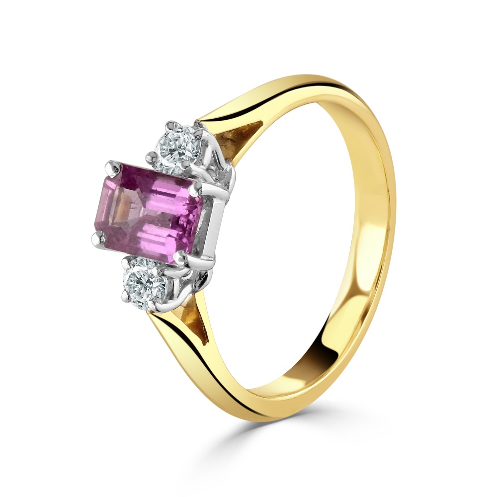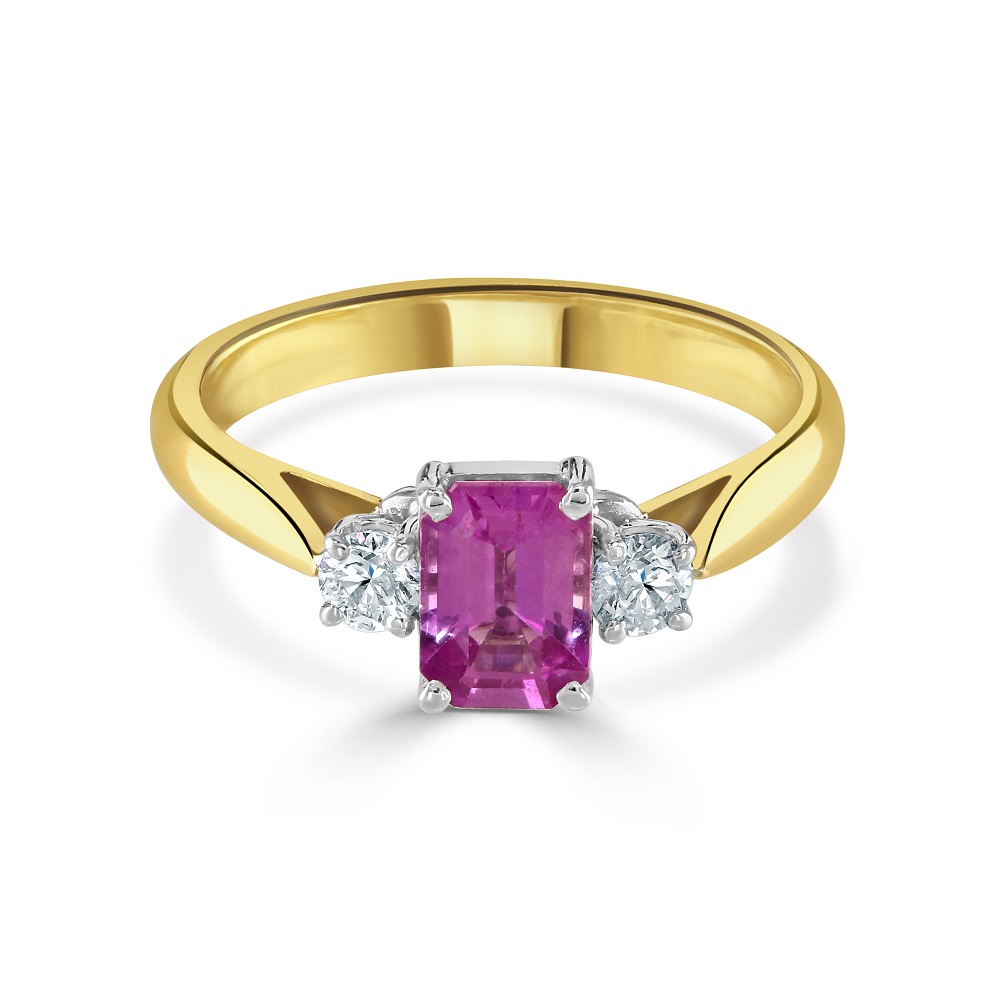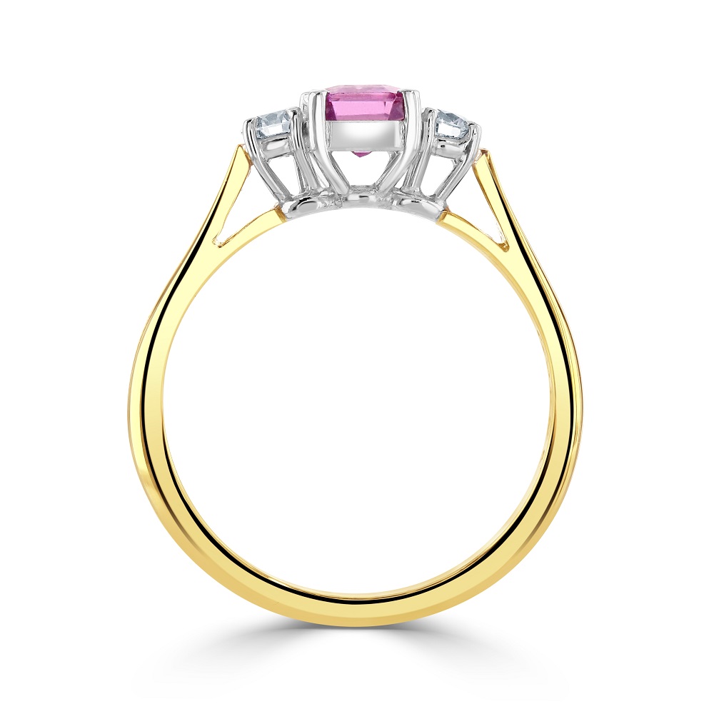 Our exquisite 18ct trilogy gemstone ring features a mesmerizing rectangular-shaped pink sapphire, securely held by four claws at the centre. This stunning sapphire is flanked by two round brilliant-cut diamonds, each meticulously set in 18ct white gold to enhance their radiant sparkle. The design is beautifully mounted on an 18ct yellow gold tapered shank, which gracefully transitions from the lustrous diamonds to the warm golden hue, creating a striking contrast.