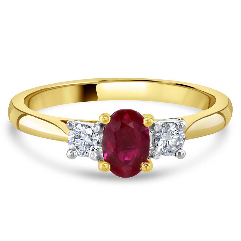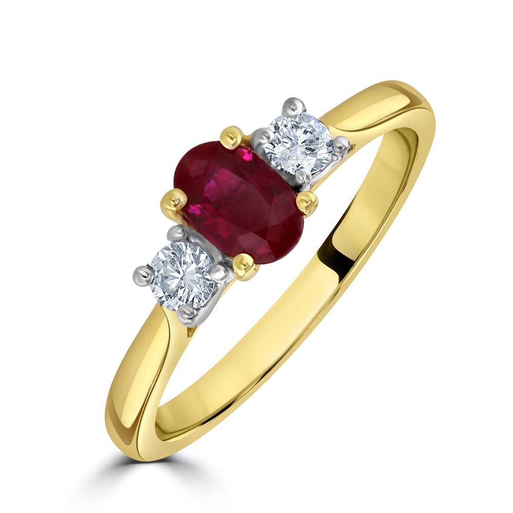 A stunning 18ct yellow and white gold trilogy ring, a breathtaking blend of classic elegance and modern design. This exquisite ring features a captivating centre oval cut ruby, weighing 0.64 carats, set in a beautiful claw setting that enhances its deep, vibrant red hue. Flanking this magnificent ruby, two round brilliant-cut diamonds, totalling 0.21 carats, are also claw set, adding a sparkling symmetry to the piece. The unique combination of yellow and white gold settings provides a sophisticated contrast that highlights the brilliance of the diamonds and the richness of the ruby. Ideal for engagements, anniversaries, or as a luxurious gift, this trilogy ring is a timeless treasure that symbolizes love and commitment.