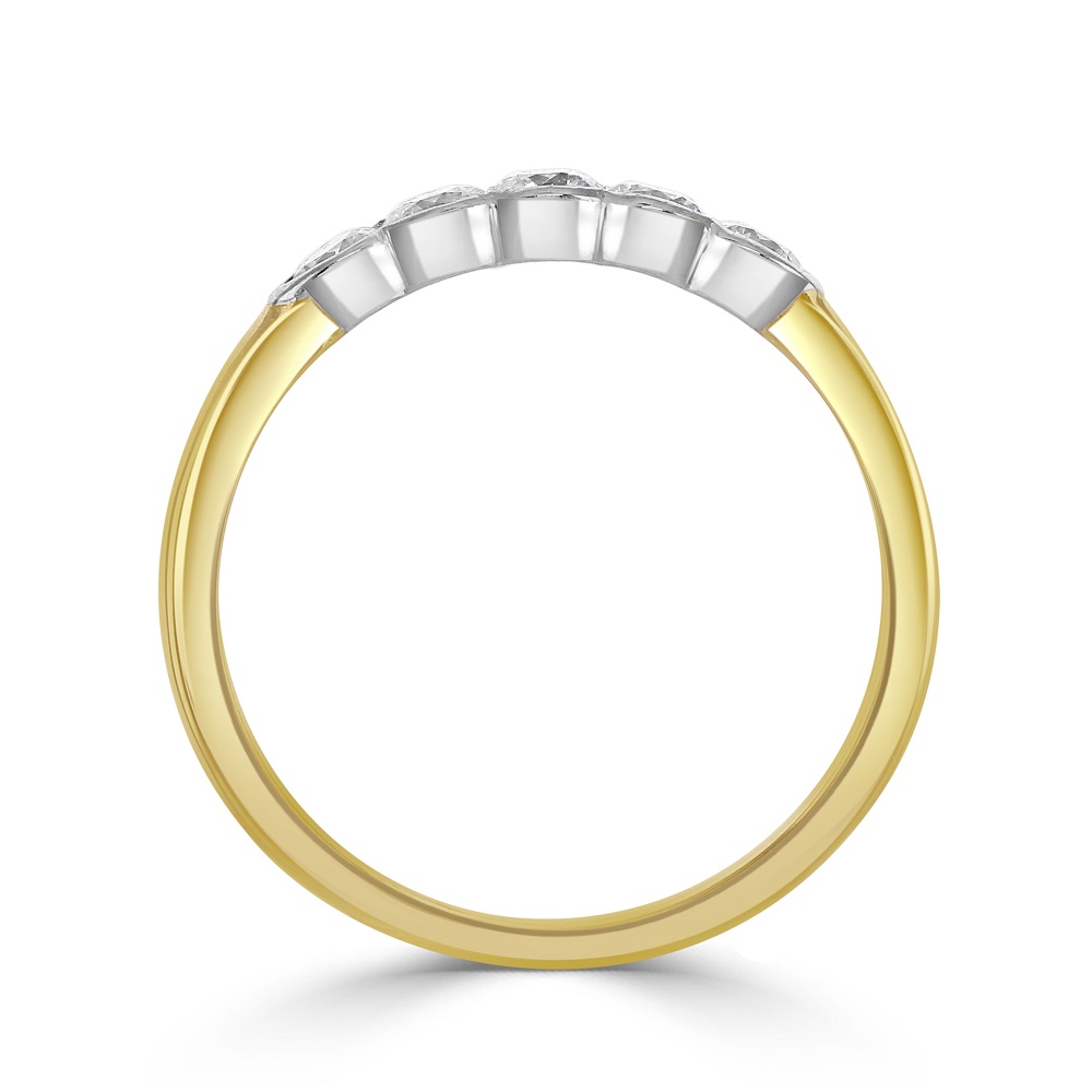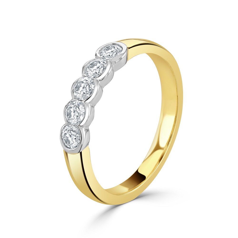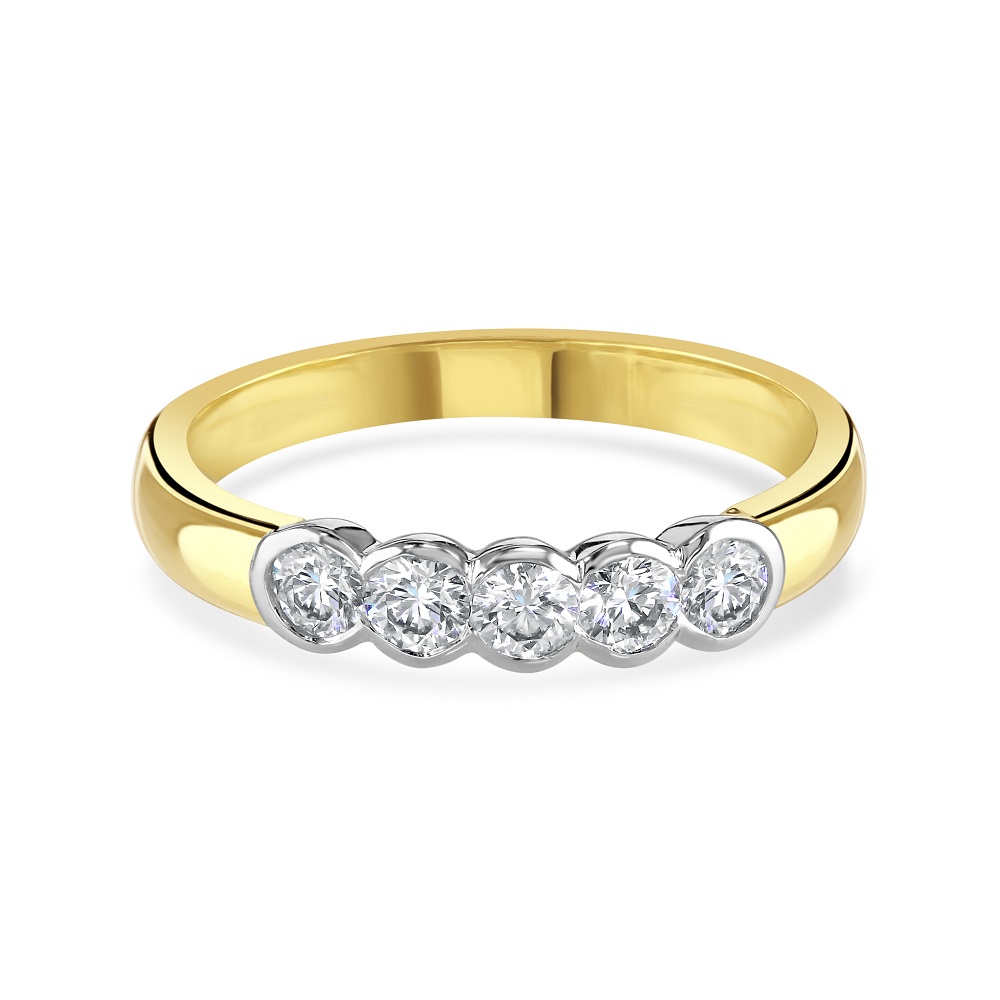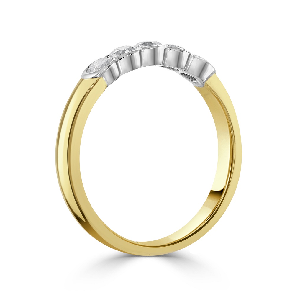 An elegant 18ct yellow and white gold eternity ring, flawlessly designed to capture the essence of everlasting love. This exquisite ring features a sophisticated rubover setting that encases five round brilliant cut diamonds, totalling 0.48ct. Each diamond is meticulously chosen for its brilliance and clarity, providing a continuous band of light that symbolizes eternal devotion. The dual-tone design of this ring combines the warm lustre of yellow gold with the cool sheen of white gold, creating a stunning visual contrast that enhances the sparkle of the diamonds. This rubover set offers a modern twist on the classic eternity ring, ensuring each diamond is both secure and prominently displayed. Ideal for anniversaries, special occasions, or as a meaningful gift, this half eternity ring is a celebration of both craftsmanship and style. It’s perfect for those who appreciate a mix of contemporary design and traditional luxury, providing a chic and captivating addition to any jewellery collection.
