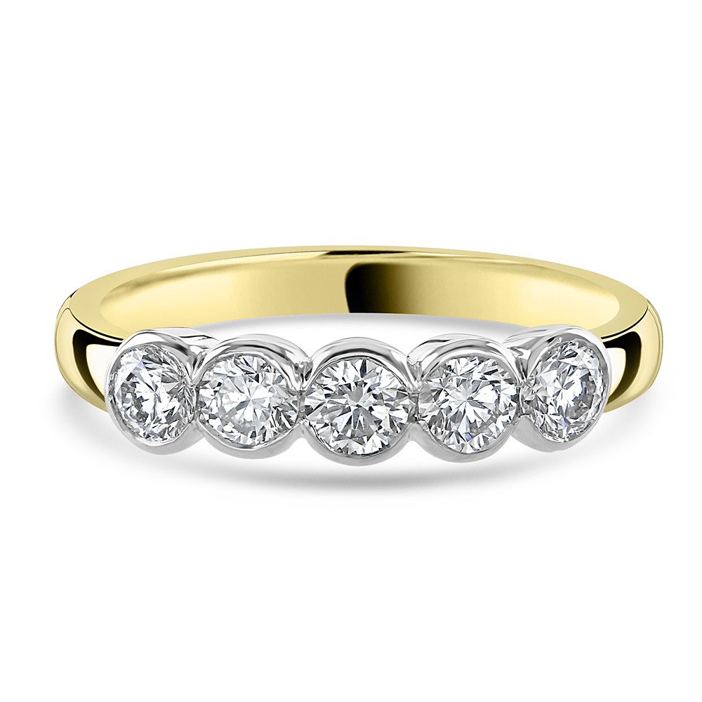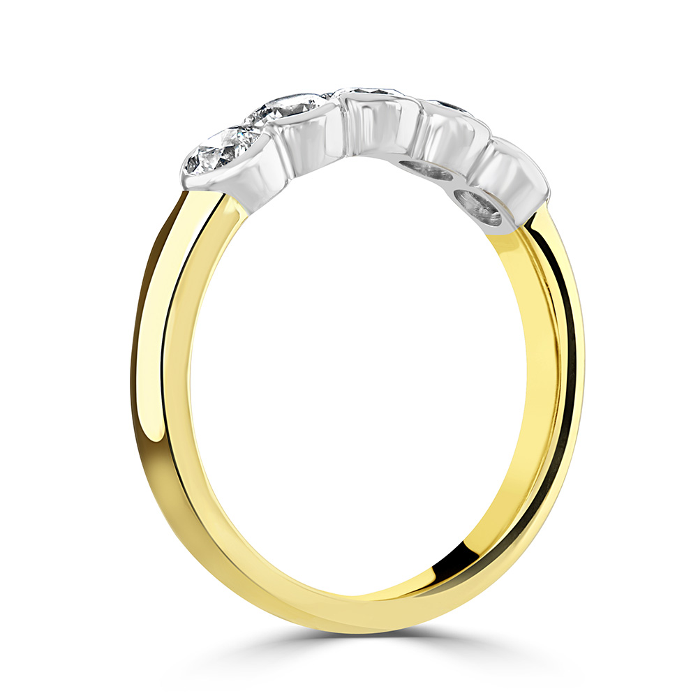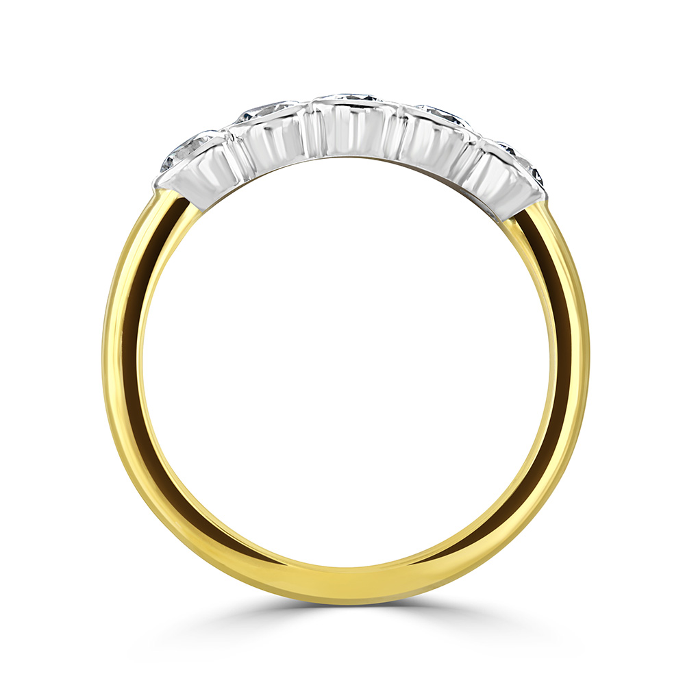 Our exquisite 18ct yellow and white gold eternity ring is a luxurious symbol of enduring love. This elegant ring features five round brilliant cut diamonds, totalling 0.80 carats, each expertly rubover set to enhance their natural brilliance and security. The unique combination of yellow and white gold provides a stunning contrast that accentuates the sparkle of the diamonds and adds a contemporary flair to this classic design. Perfect for an anniversary, as a wedding band, or a sophisticated addition to your jewellery collection, this half eternity ring is designed to celebrate lasting connections with timeless elegance and style