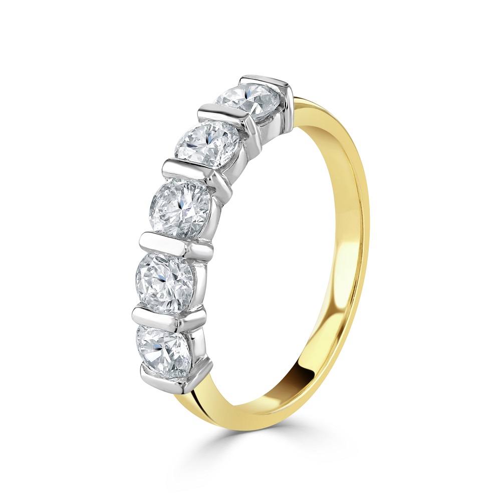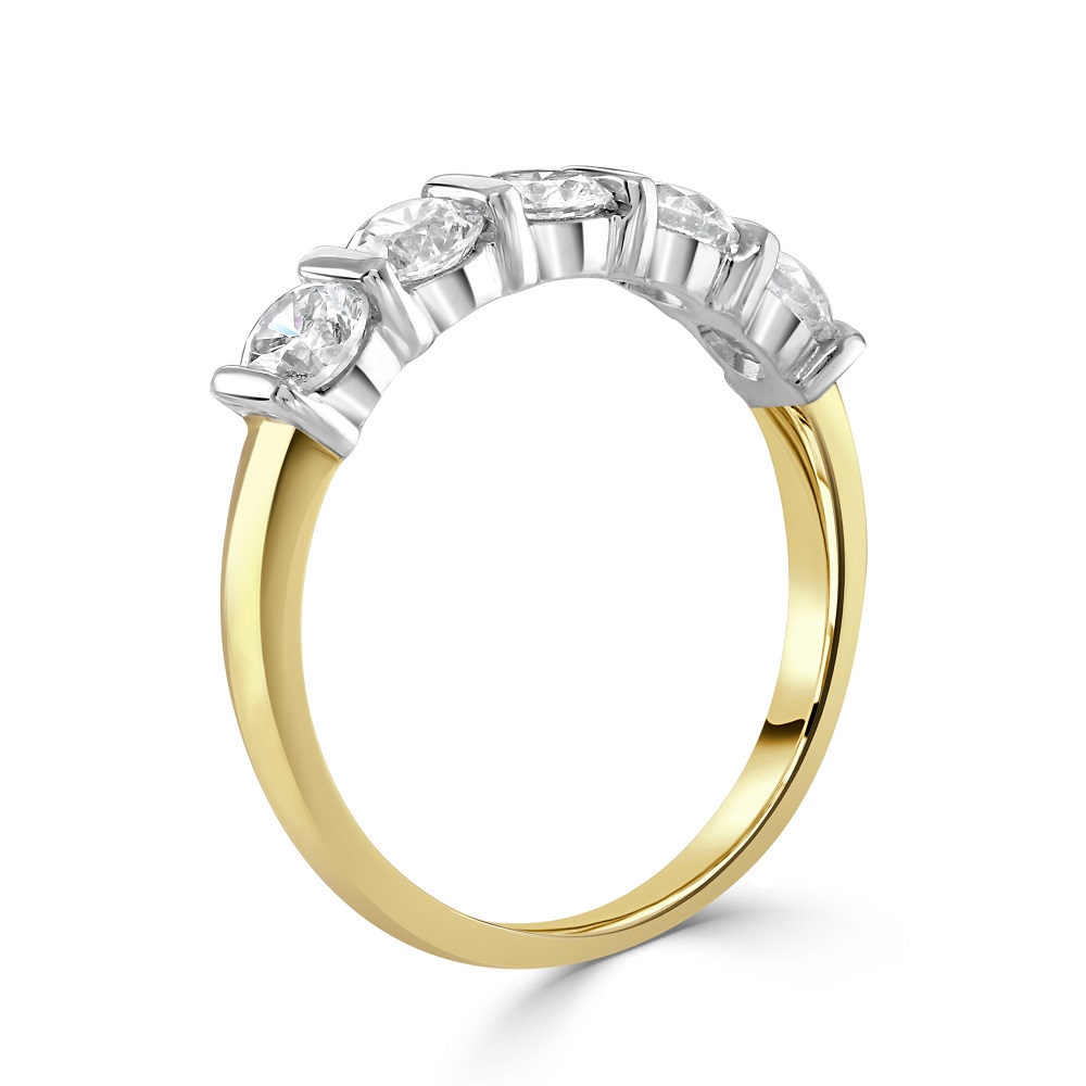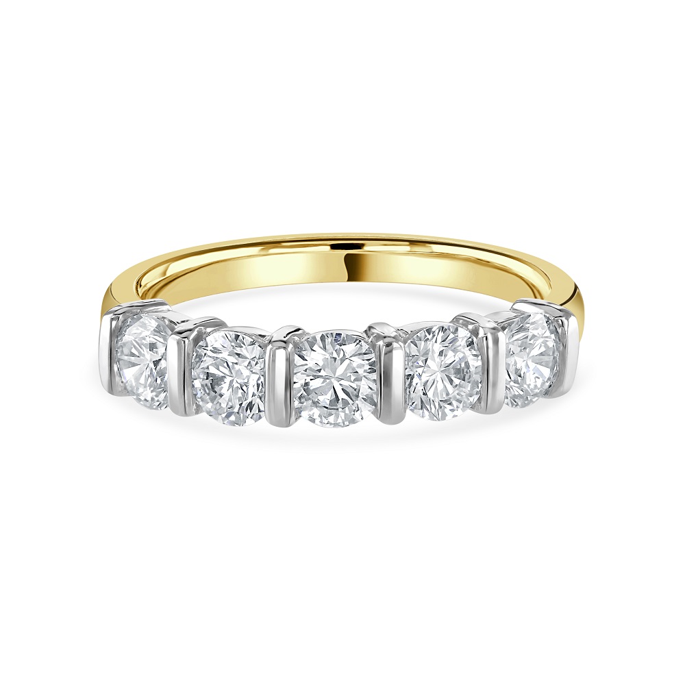 Explore the timeless allure of our 18ct yellow and white gold half eternity ring, expertly crafted to symbolize enduring love. This exquisite ring features five round brilliant cut diamonds, totalling 1.29 carats, each meticulously bar set to highlight their exceptional clarity and brilliance. The unique combination of yellow and white gold offers a striking, contemporary contrast, enhancing the visual appeal of the diamonds. Designed for those who appreciate elegant simplicity paired with luxurious detail, this half eternity ring is perfect for commemorating significant milestones or as a sophisticated addition to any fine jewellery collection. Whether worn daily or on special occasions, this ring promises to add a touch of sparkle and timeless elegance to your ensemble.