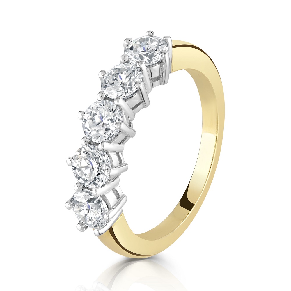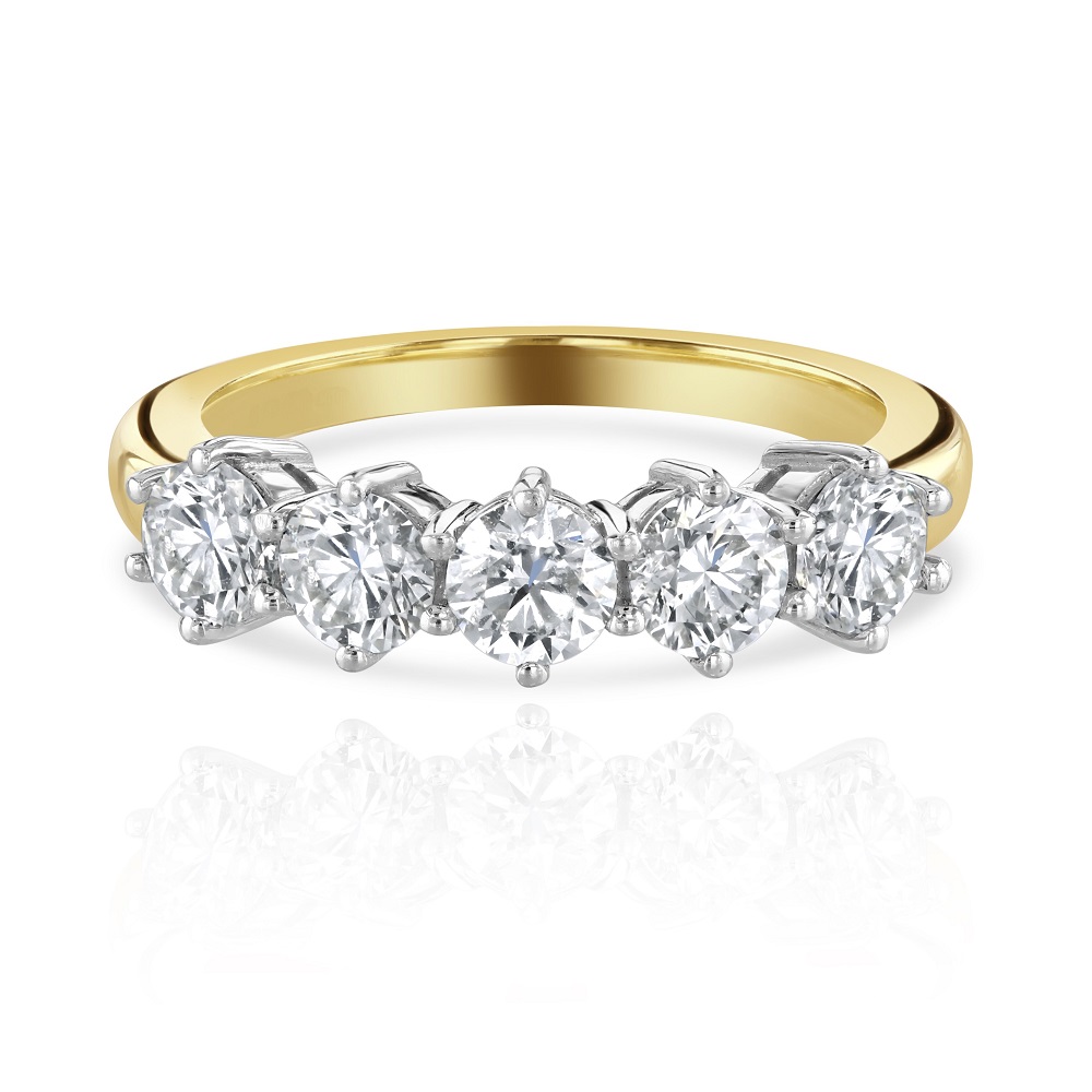 A beautiful 18ct yellow gold half eternity ring with five scintillating round brilliant cut diamonds all set in bright white gold claw settings. Like many of our rings this piece has been hand finished and set in in the UK. Other sizes and variations are available, please contact the store for more information.