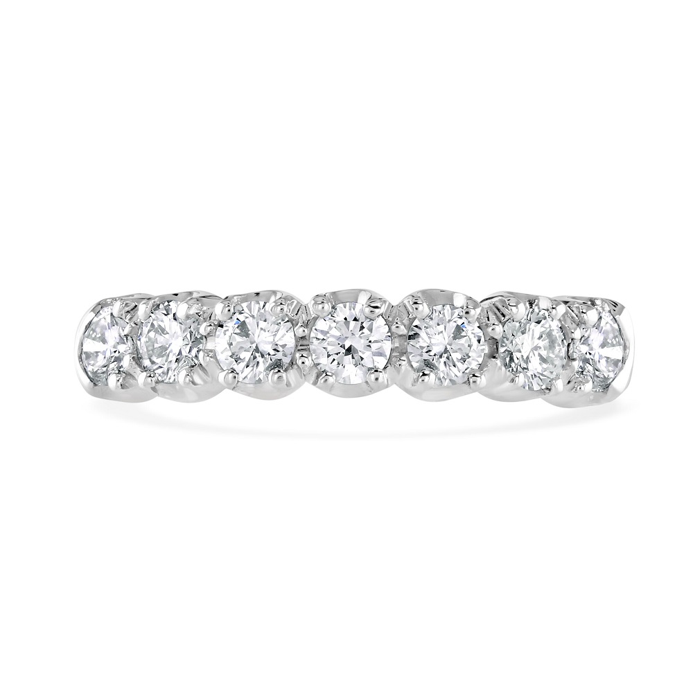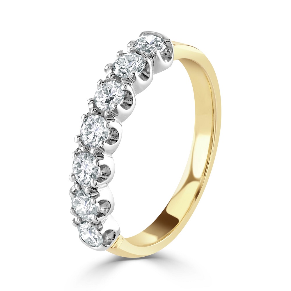A timeless eternity ring, beautifully crafted from the finest 18ct yellow and white gold. This luxurious piece features a unique scalloped claw setting, holding seven dazzling round brilliant cut diamonds that shimmer with every turn. Each diamond is expertly cut to maximize brilliance and sparkle, creating a stunning display of light and luxury. The harmonious blend of yellow and white gold adds a modern twist to this classic design, making it a versatile addition to any jewellery collection. Perfect for celebrating life's special moments, this half eternity ring is a symbol of everlasting love and eternal style.