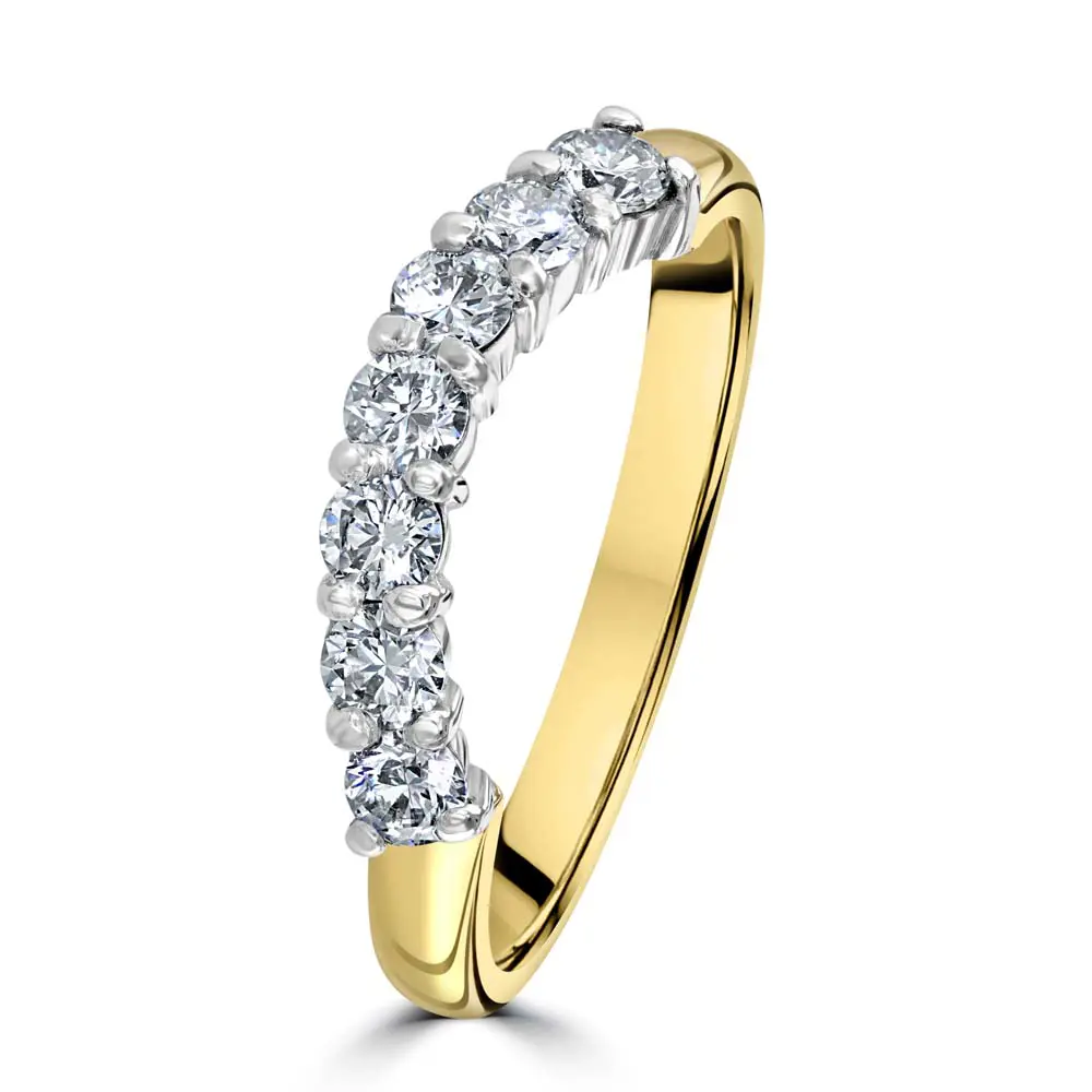 This sophisticated half eternity ring is beautifully crafted in a harmonious blend of 18ct yellow and white gold, creating a striking two-tone design. The gently curved band is adorned with seven round brilliant-cut diamonds, each securely held in a classic claw setting to maximise brilliance and light reflection. With an approximate total diamond weight of 0.70ct, these diamonds radiate exceptional sparkle, making this piece a perfect choice for marking life’s most meaningful moments. Its graceful curve allows for a seamless fit alongside an engagement ring or as a statement piece on its own.