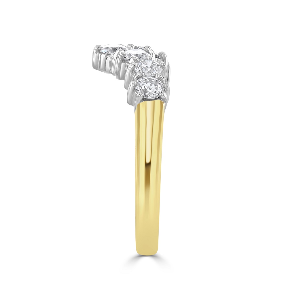 Explore the elegance of our 18ct yellow and white gold 'V' shaped half eternity ring, a beautifully designed piece that merges classic style with modern flair. This luxurious ring features seven round brilliant cut diamonds, collectively weighing 1.10 carats, each meticulously four-claw set to enhance their sparkle and brilliance. The 'V' shaped design offers a unique twist on the traditional half eternity ring, providing a contemporary look that stands out. Crafted from a combination of yellow and white gold, this ring offers a stunning two-tone effect that is both eye-catching and sophisticated. Perfect for celebrating significant milestones or as a stylish addition to your daily jewellery rotation, this half eternity ring is sure to captivate and charm.