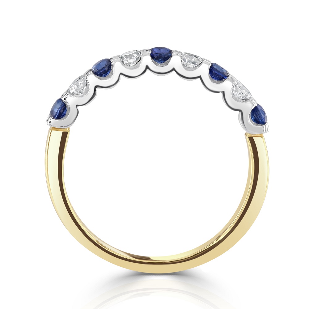 An elegant 18ct yellow and white gold half eternity ring, expertly designed with a seamless cog setting. This stunning ring features an alternating pattern of five round sapphires and four round brilliant-cut diamonds, meticulously set to showcase their vibrant colours and sparkling brilliance.