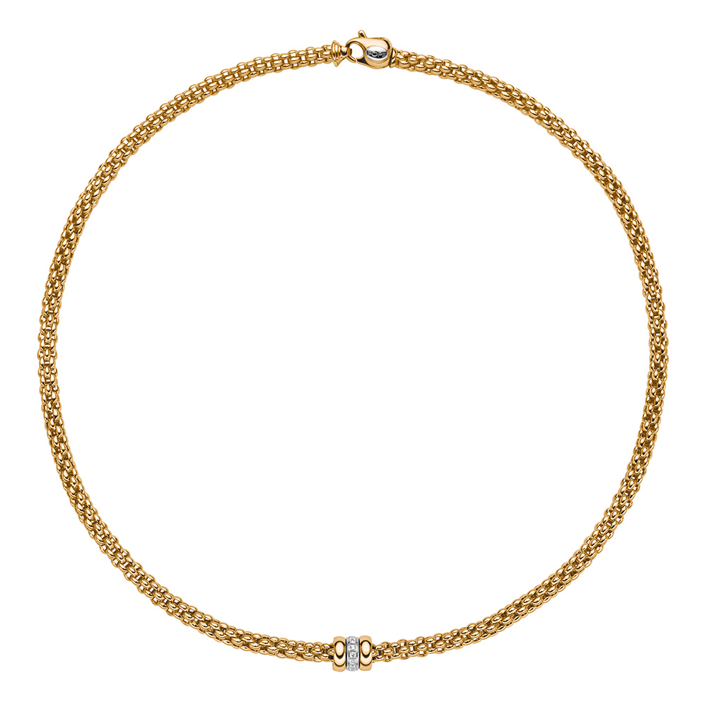 Discover the luxurious 18ct yellow gold Flex'it Solo necklace from the renowned Italian designers at Fope Gioielli. This beautifully crafted necklace features three rondels, with the central rondel exquisitely set in white gold and embellished with diamonds totalling 0.10 carats. The innovative Flex'it design ensures the necklace offers not only exceptional style but also comfort and flexibility, adapting elegantly to the wearer's movements. The contrasting yellow and white gold adds a contemporary touch to this piece, making it a versatile addition to any jewellery collection. Ideal for adding a refined sparkle to everyday looks or enhancing evening attire, this necklace stands out for its design excellence and classic appeal.