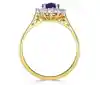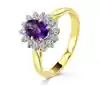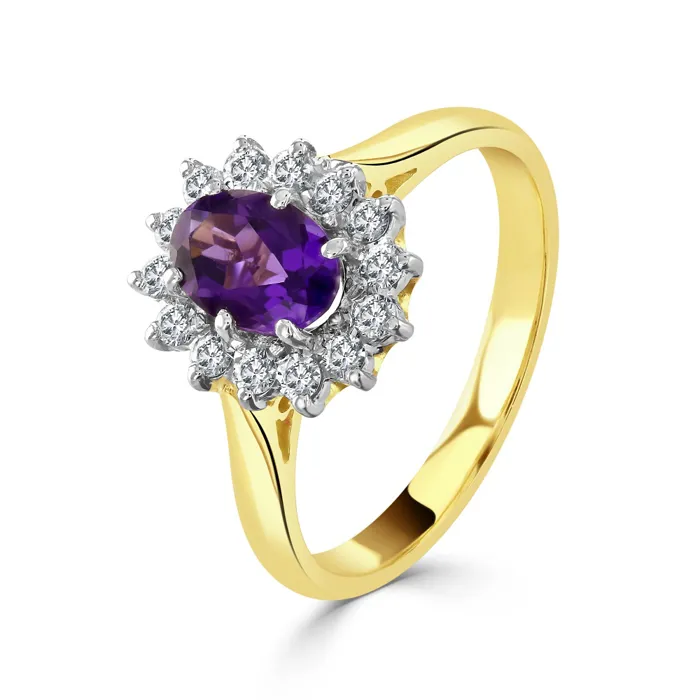 An elegant 18ct yellow and white gold cluster ring featuring a captivating oval cut amethyst, renowned for its deep, rich purple hue and weighing approximately 0.77ct. This stunning gemstone symbolizes wisdom, tranquillity, and luxury, making it a perfect centrepiece for this elegant ring. Encircling the amethyst is a halo of 14 round brilliant cut diamonds. These diamonds have been meticulously selected for their unmatched sparkle and brilliance, creating a radiant contrast that enhances the beauty of the central amethyst. Each diamond is claw-set, ensuring maximum exposure to light and amplifying their dazzling effect. The use of both yellow and white gold adds a contemporary twist to the classic cluster design, appealing to both traditional and modern tastes.