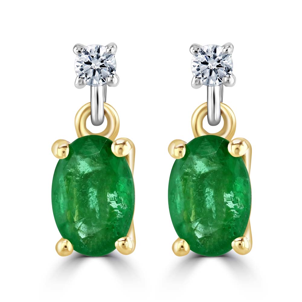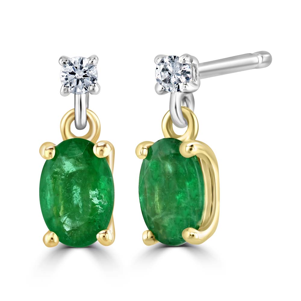 An alluring pair of dual-toned 18ct yellow and white gold drop earrings, each featuring a captivating design that combines the classic elegance of diamonds with the vibrant charm of emeralds. The earrings start with a single round brilliant cut diamond stud, securely held in a four-claw setting, leading to a beautifully suspended oval-shaped emerald, also set in a four-claw setting. These exquisite earrings boast a total emerald weight of 0.90 carats, displaying rich, deep green hues that perfectly complement the 0.06 carats of sparkling diamonds. The contrast between the warm yellow gold and the sleek white gold enhances the gemstones' radiance, creating a luxurious and eye-catching accessory.