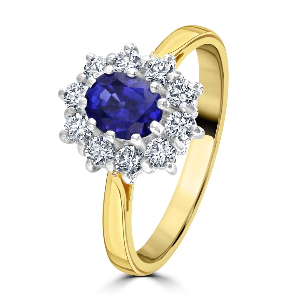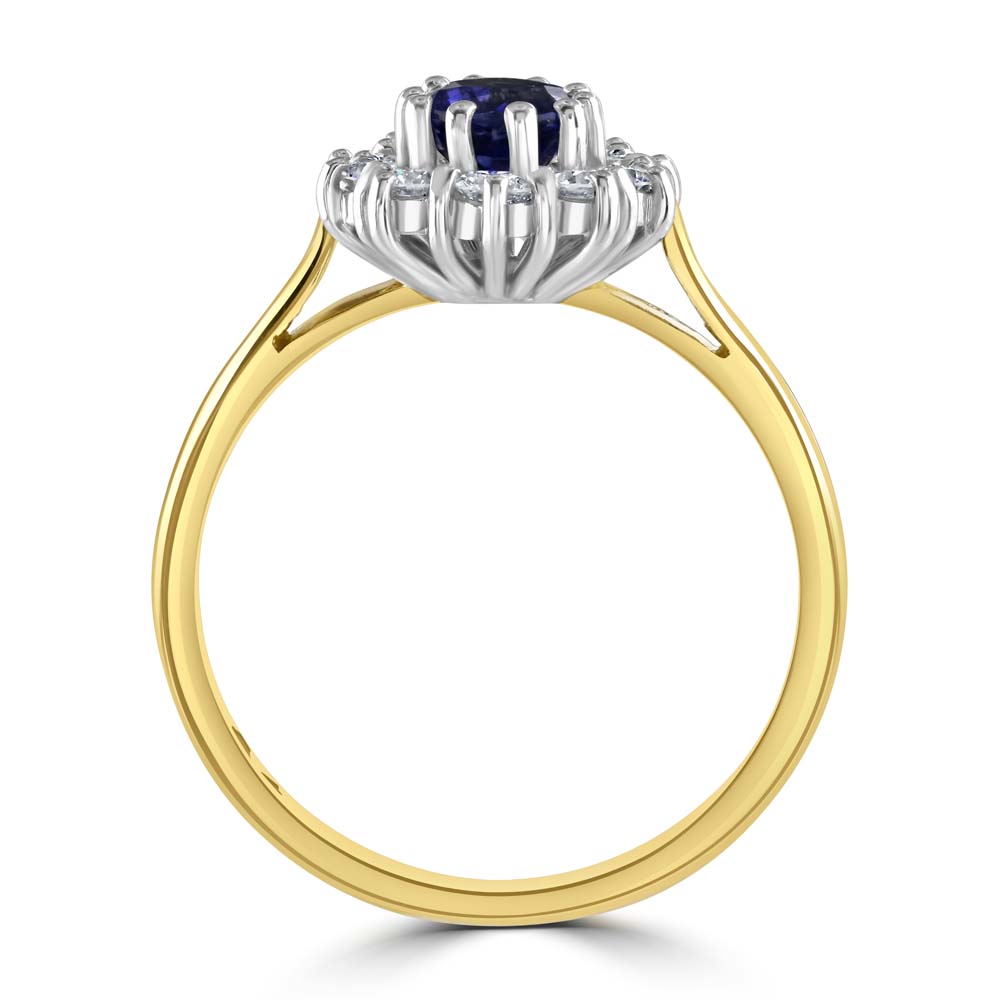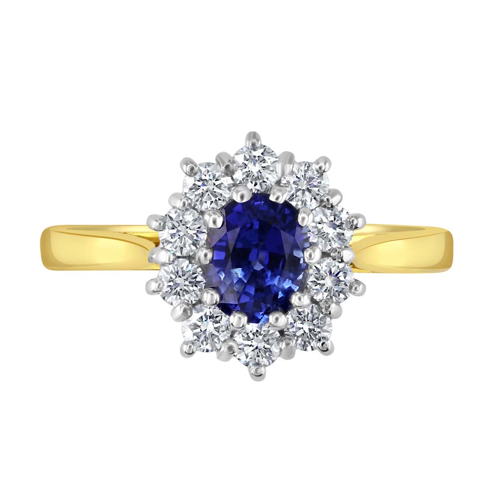 Discover the timeless beauty of our 18ct yellow and white gold cluster ring, featuring a captivating oval cut sapphire at its centre, securely set in a classic claw setting. This stunning sapphire, weighing 0.85 carats, is surrounded by a halo of ten claw-set round brilliant cut diamonds, adding an extra touch of brilliance and elegance. The total diamond weight is 0.43 carats, perfectly complementing the vibrant sapphire. Ideal for celebrating special moments or enhancing your jewellery collection, this 18ct yellow and white gold cluster ring combines luxurious design with exceptional craftsmanship. The rich yellow gold band and elegant white gold settings beautifully enhance the deep blue hue of the sapphire and the dazzling sparkle of the diamonds, creating a piece that symbolizes enduring love and sophistication. Experience the unparalleled beauty and refined artistry of this stunning piece, designed to be cherished for a lifetime.