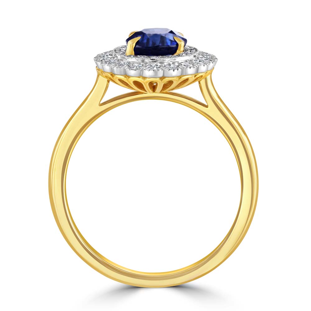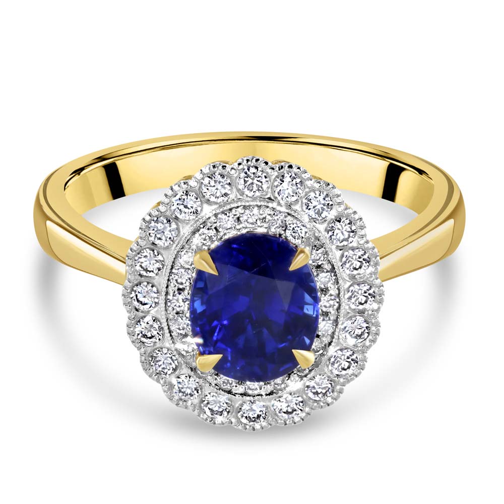 A striking fusion of classic elegance and vintage-inspired detail, this exquisite cluster ring is crafted in 18ct yellow and white gold, offering a rich contrast that enhances its timeless appeal. At its heart lies a mesmerising 1.68 carat oval-cut sapphire, secured in a graceful four-claw setting, radiating deep, velvety blue tones. Encircling the centre stone are two concentric rows of round brilliant-cut diamonds, totalling 0.31 carats, each meticulously set to maximise brilliance and fire. A delicate milgrain edge frames the cluster, lending a refined, antique finish that speaks to exceptional craftsmanship. This piece is a celebration of enduring beauty—perfect for those who appreciate heritage design with a contemporary twist.
