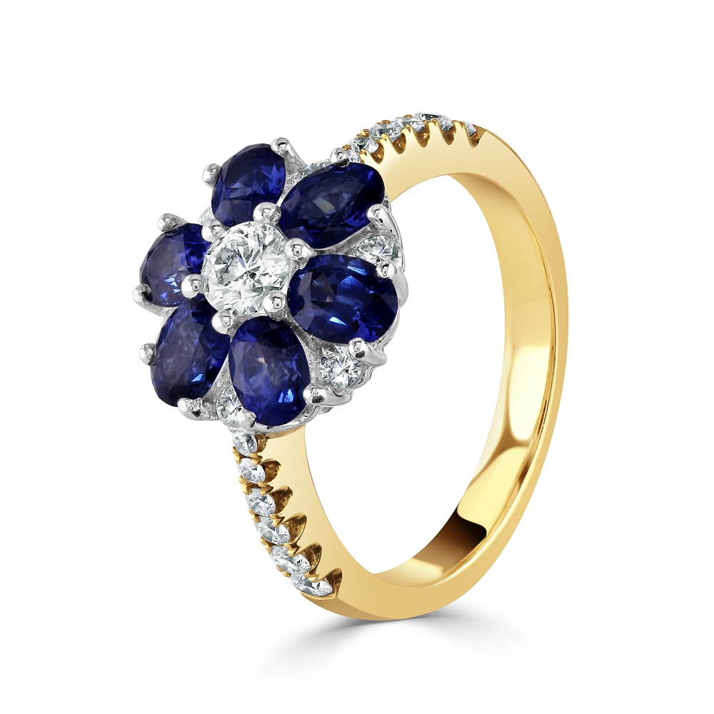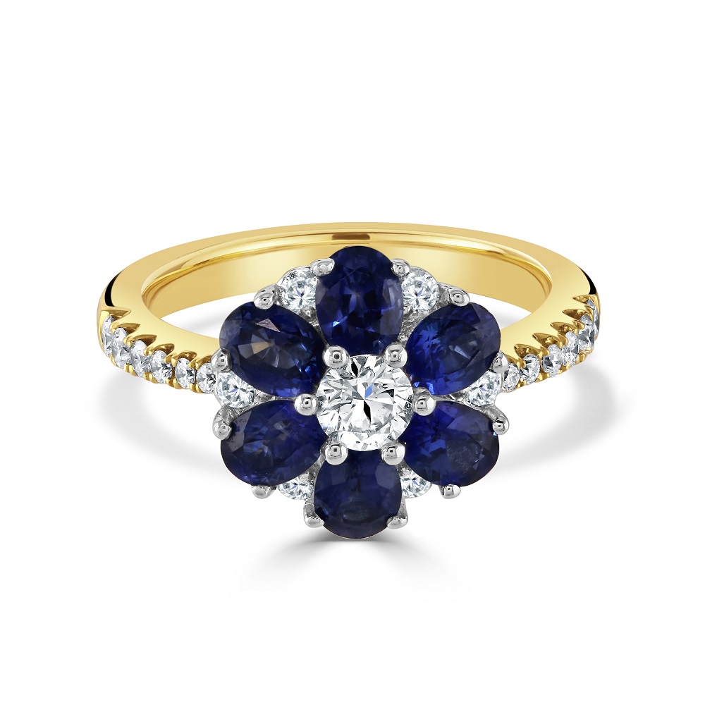 An enchanting 18ct yellow gold cluster ring, an exquisite addition to our fine jewellery collection. This ring showcases a captivating design with six oval sapphires, totalling 1.81 carats, and seven round brilliant cut diamonds arranged in a floral 'petal' pattern. At the centre, a single round brilliant cut diamond adds a luminous focal point, brilliantly complemented by diamond-set shoulders for additional sparkle.