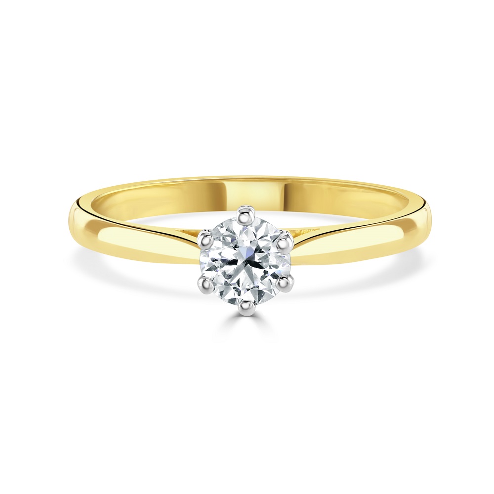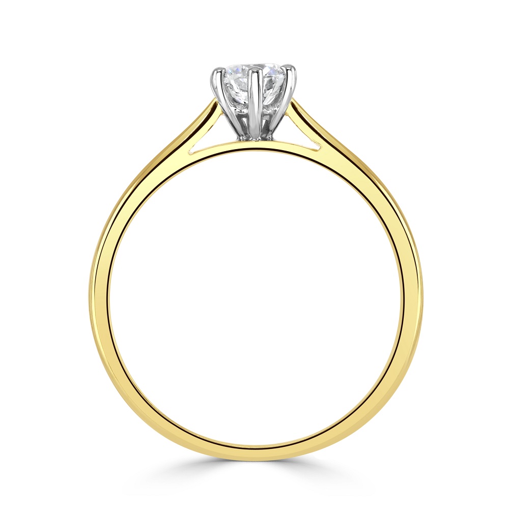 Timeless and sophisticated, this 18ct yellow and white gold solitaire ring features a dazzling 0.40ct round brilliant cut diamond, securely held in a classic six-claw setting. The diamond boasts a beautiful G colour and SI1 clarity, offering exceptional sparkle and fire. The two-tone design combines the warmth of yellow gold with the sleek elegance of white gold, enhancing the brilliance of the central stone while adding a subtle contrast that elevates the overall aesthetic. A timeless symbol of love and elegance, this ring is perfect as an engagement piece or a classic addition to any fine jewellery collection.