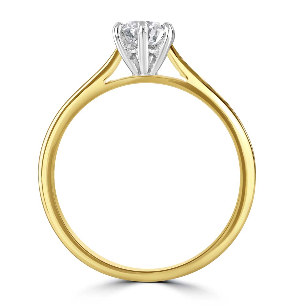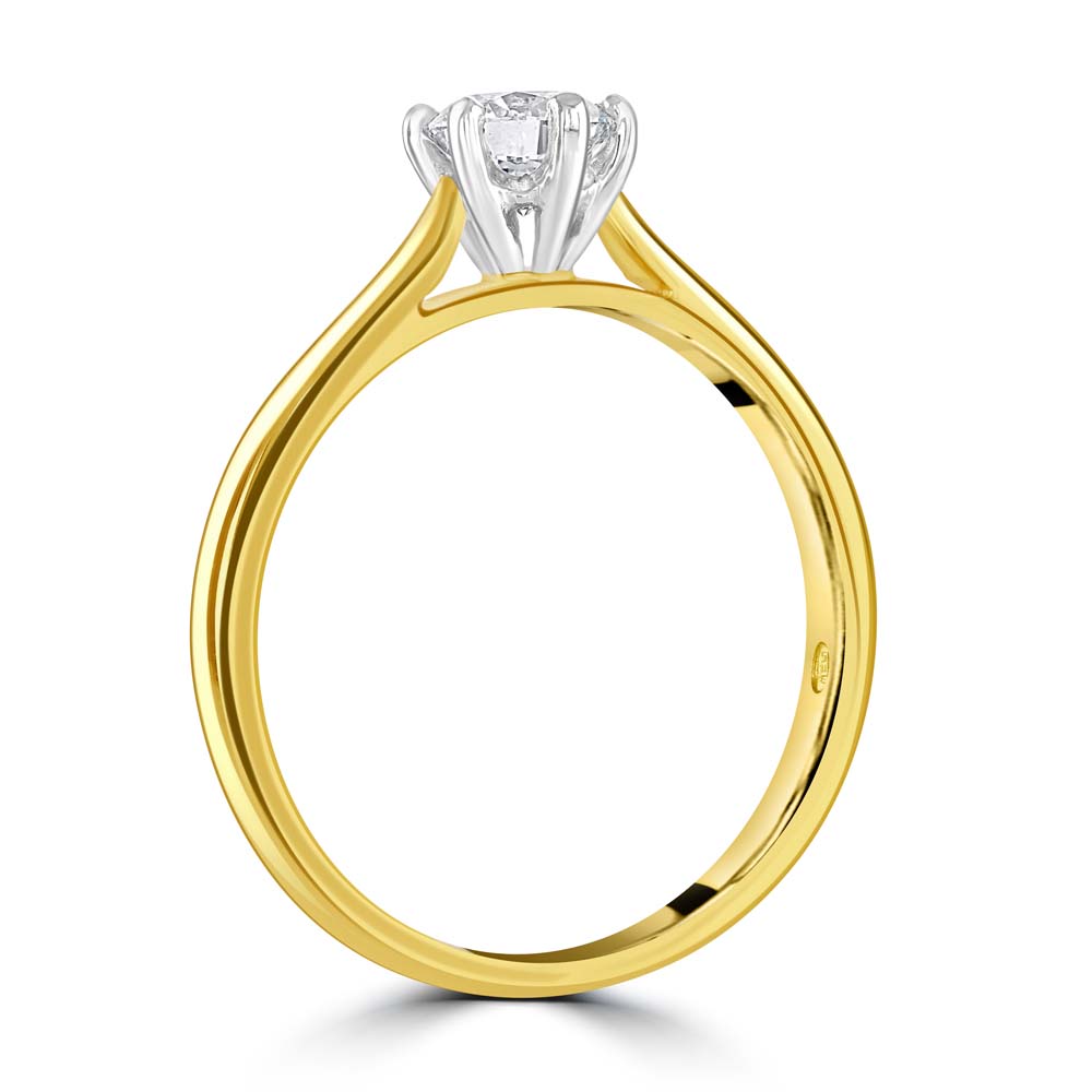 Classic elegance meets refined craftsmanship in this 18ct yellow and white gold solitaire ring, featuring a dazzling 0.51ct round brilliant cut diamond. Expertly six-claw set in white gold to enhance its brilliance, the diamond is graded E colour and SI1 clarity, offering exceptional sparkle and near-colourless purity. The tapered yellow gold shank adds a graceful contour to the design, creating a timeless silhouette that blends warmth and sophistication. The contrast between the white gold setting and yellow gold band highlights the beauty of the central stone, making it a perfect choice for an engagement or a meaningful milestone. A timeless symbol of love and elegance, this ring is a radiant addition to any fine jewellery collection.